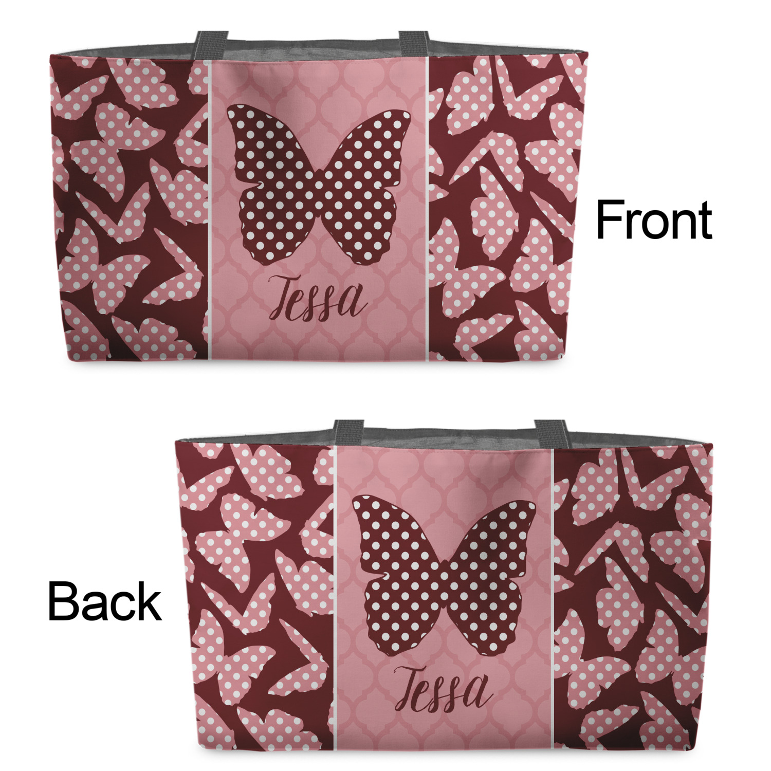 You can design the totes with a design on the front and another one on the back. The two designs can be identical or completely different. The choice is yours.