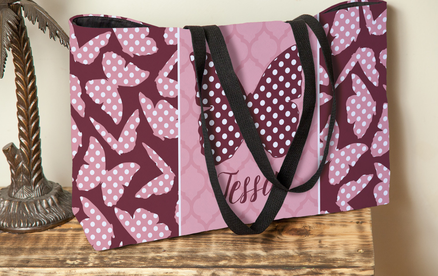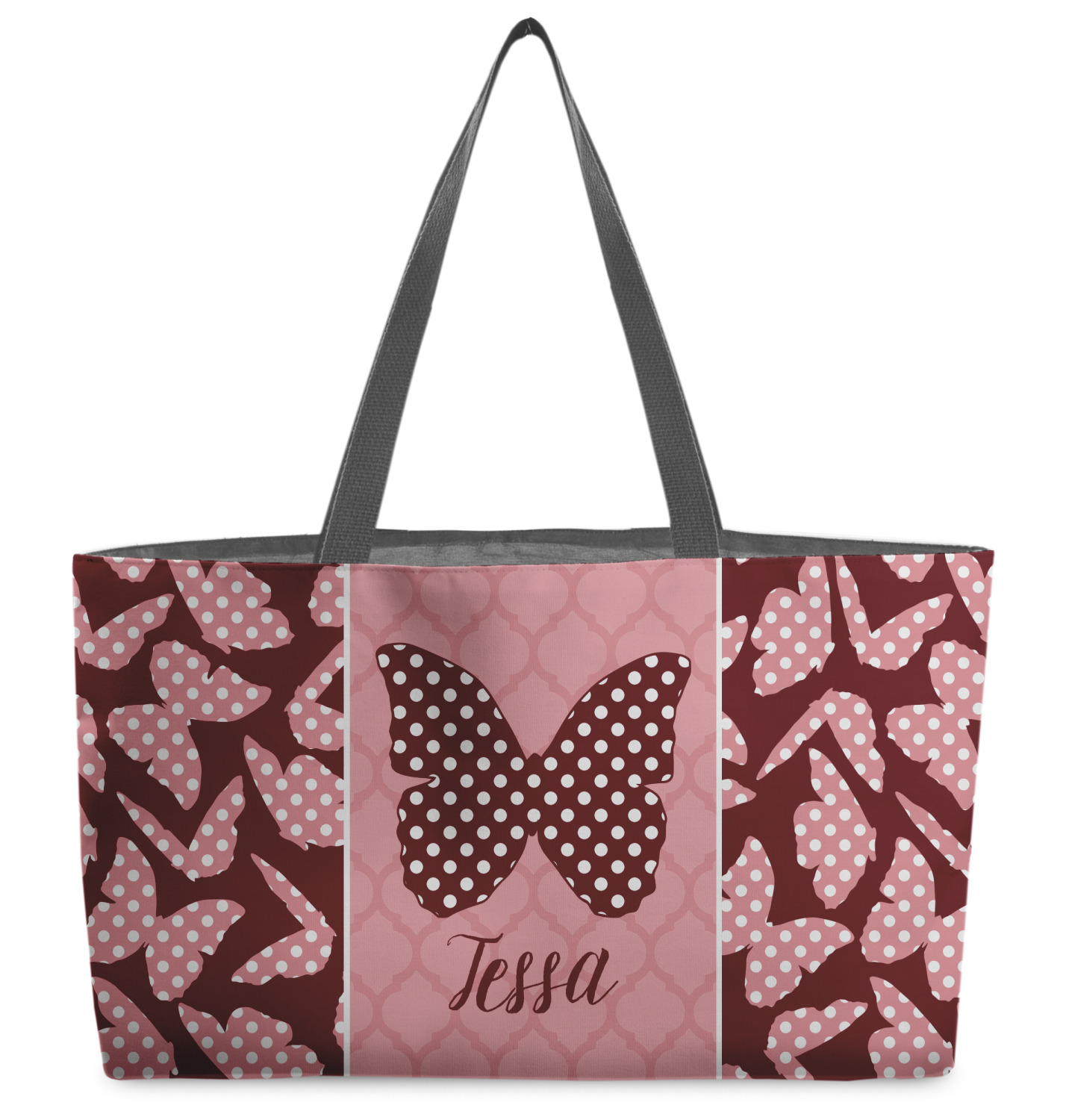 The design is split up in three parts with a polka dot butterfly pattern on either side of the middle section which has a subtle moroccan background. The foreground is personalized with a name and a fun polka dotted butterfly graphic above it. The blush and maroon compliment each other quite nicely. Easily change any of these design elements within the design center.