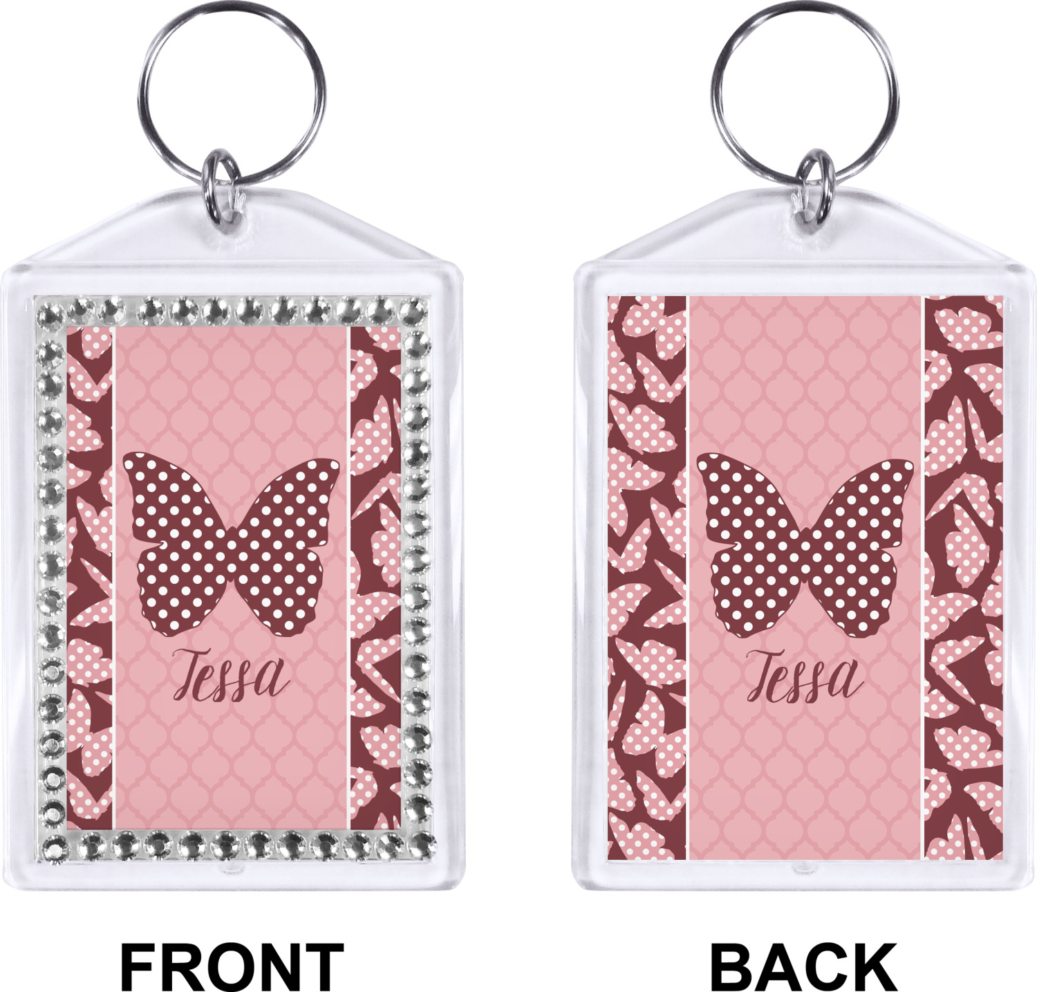 Our personalized keychains have a bold, rectangular shape, outlined by a series of shimmering rhinestones. A metal, split keyring is included with your purchase, and an additional metal hoop allows for attachment of the keychain to the split ring. This unique keychain measures at about 3.75 by 2.5 inches. We print your customized design(s) across both the back and front of this keychain.