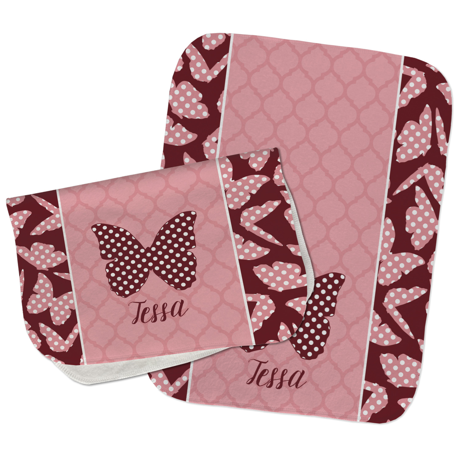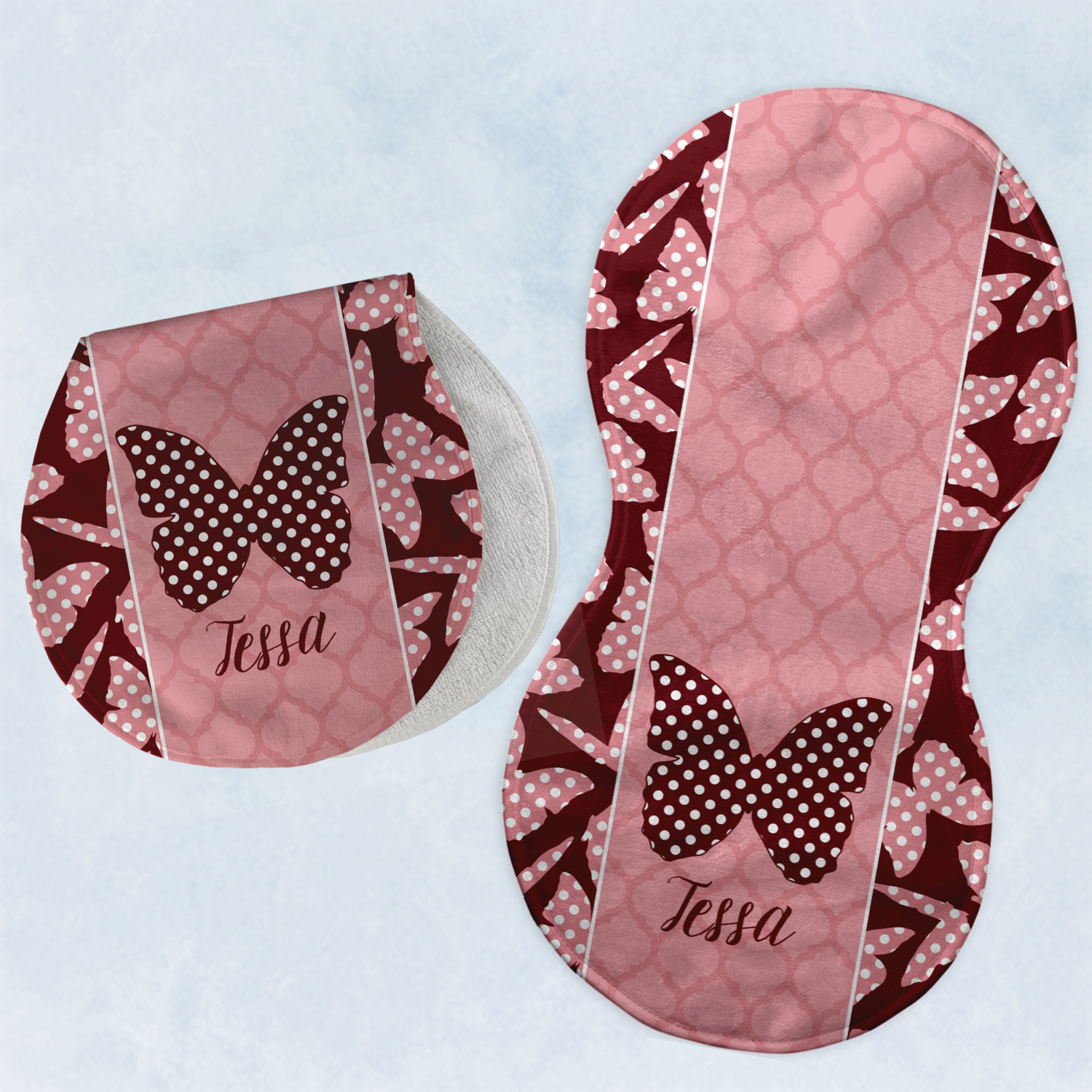 The design is split up in three parts with a polka dot butterfly pattern on either side of the middle section which has a subtle moroccan background. The foreground is personalized with a name and a fun polka dotted butterfly graphic above it. The blush and maroon compliment each other quite nicely. Easily change any of these design elements within the design center.