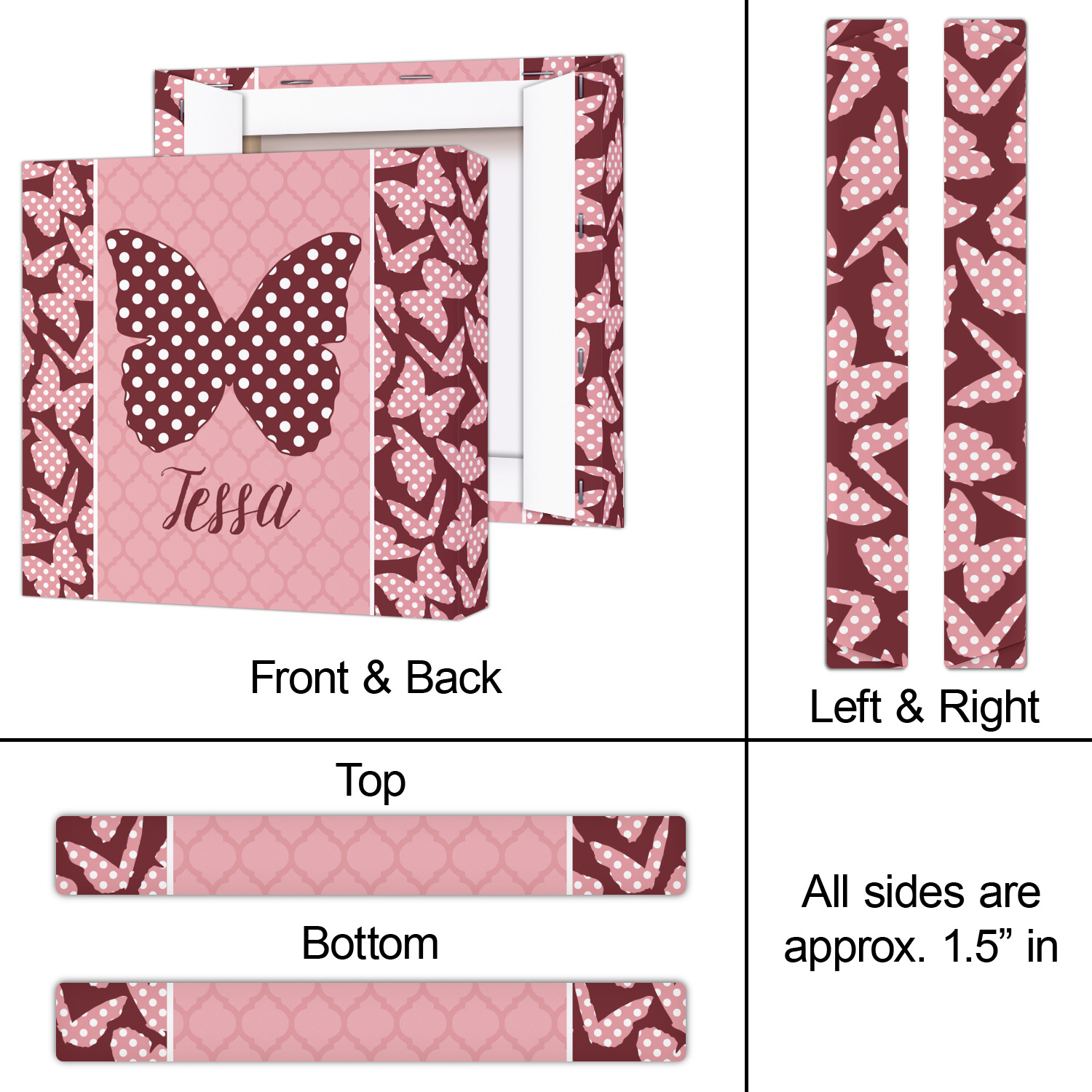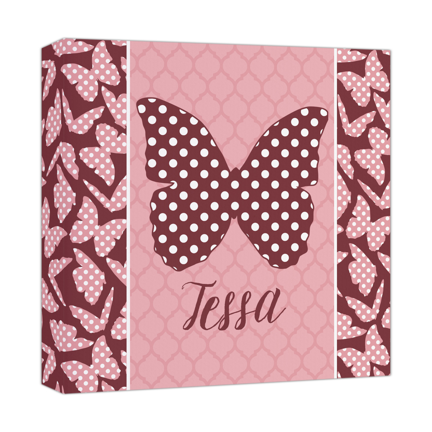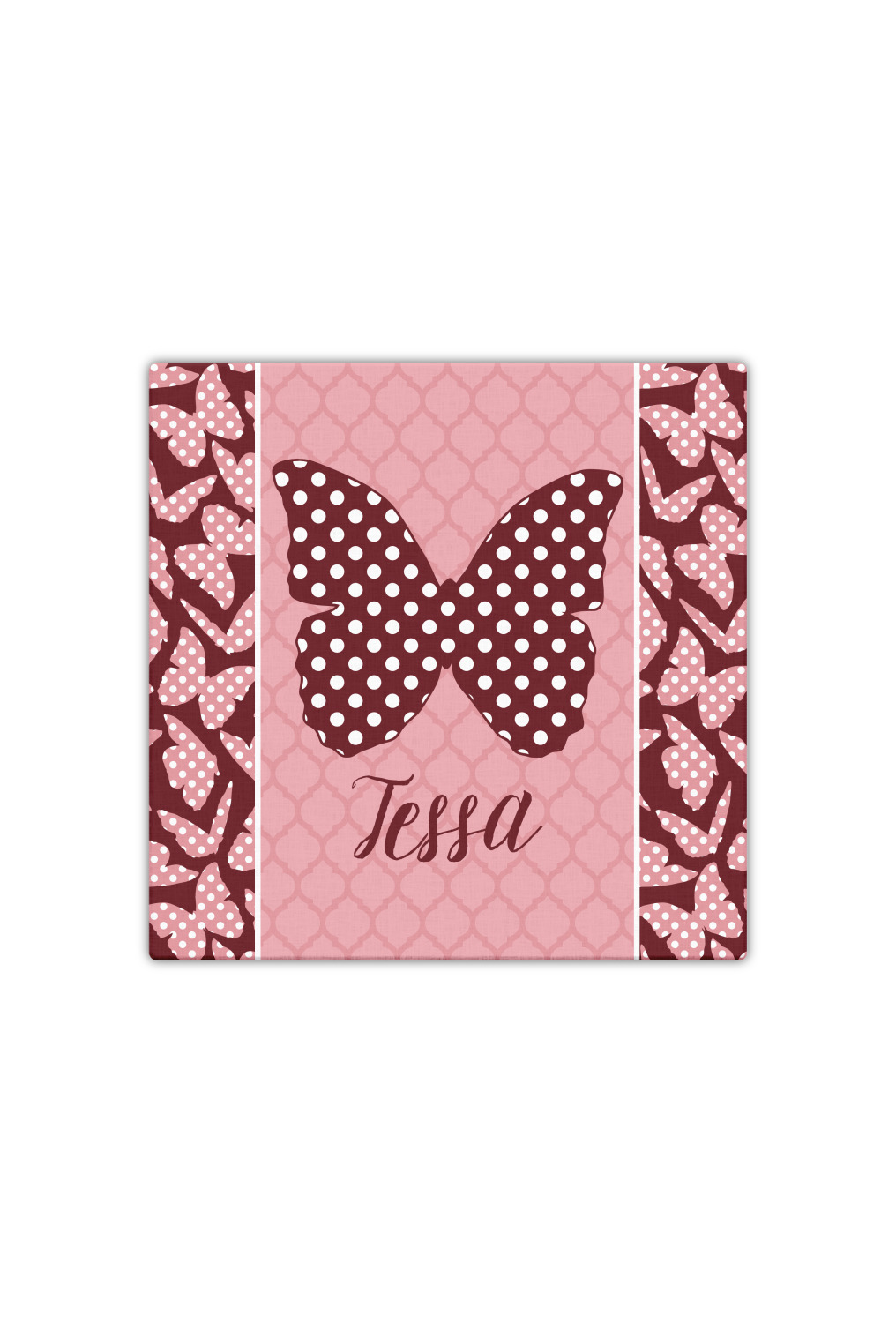 The design is split up in three parts with a polka dot butterfly pattern on either side of the middle section which has a subtle moroccan background. The foreground is personalized with a name and a fun polka dotted butterfly graphic above it. The blush and maroon compliment each other quite nicely. Easily change any of these design elements within the design center.