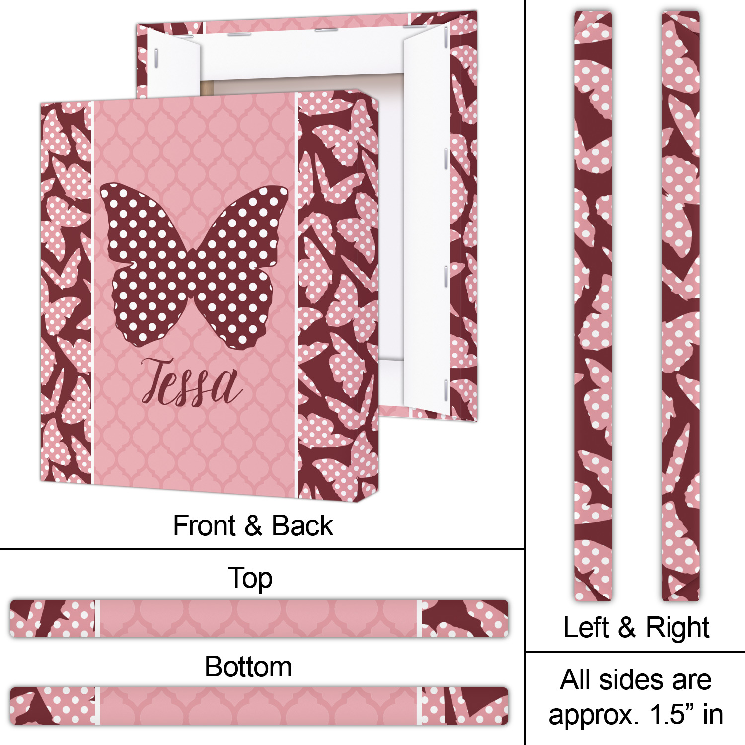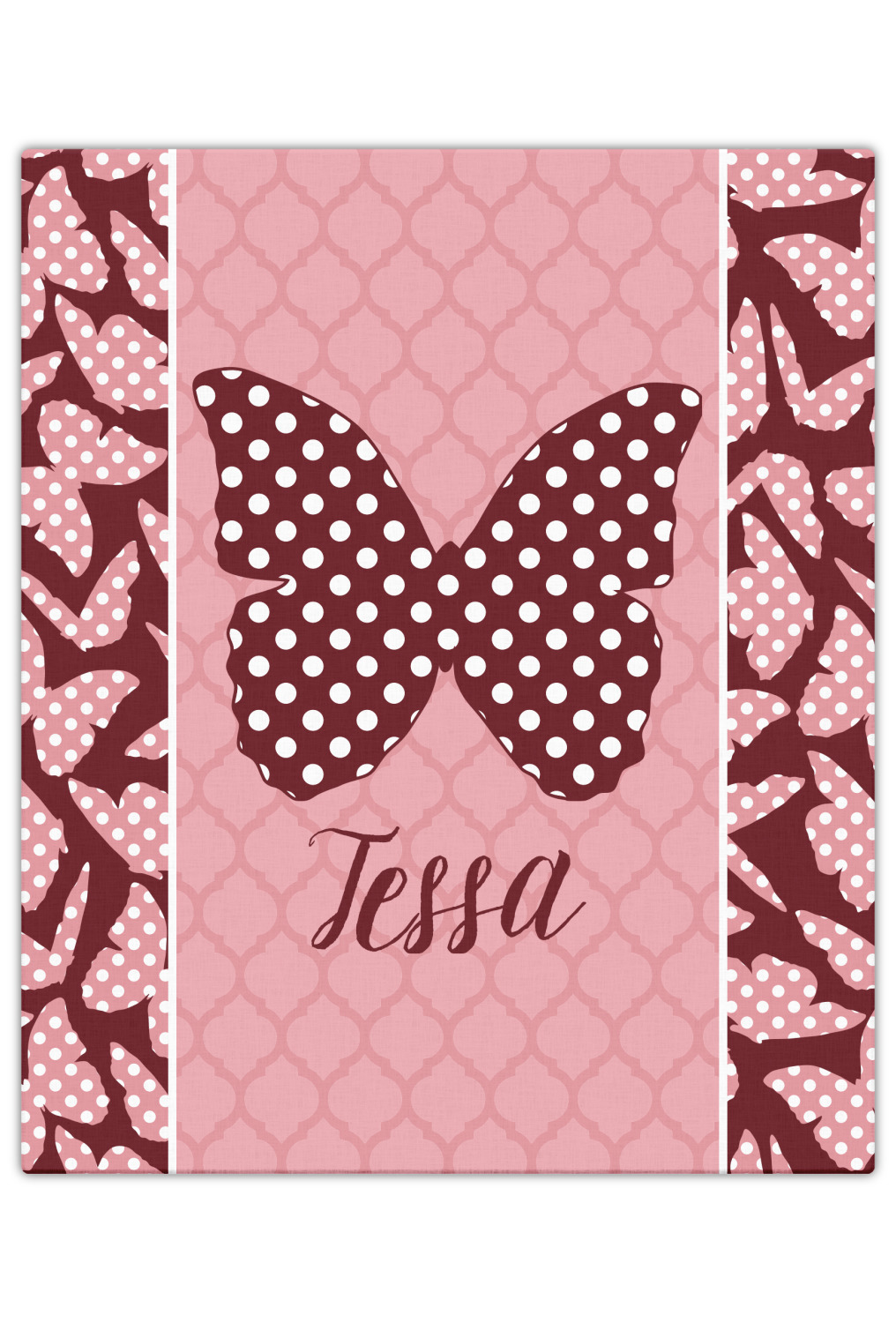 The design is split up in three parts with a polka dot butterfly pattern on either side of the middle section which has a subtle moroccan background. The foreground is personalized with a name and a fun polka dotted butterfly graphic above it. The blush and maroon compliment each other quite nicely. Easily change any of these design elements within the design center.