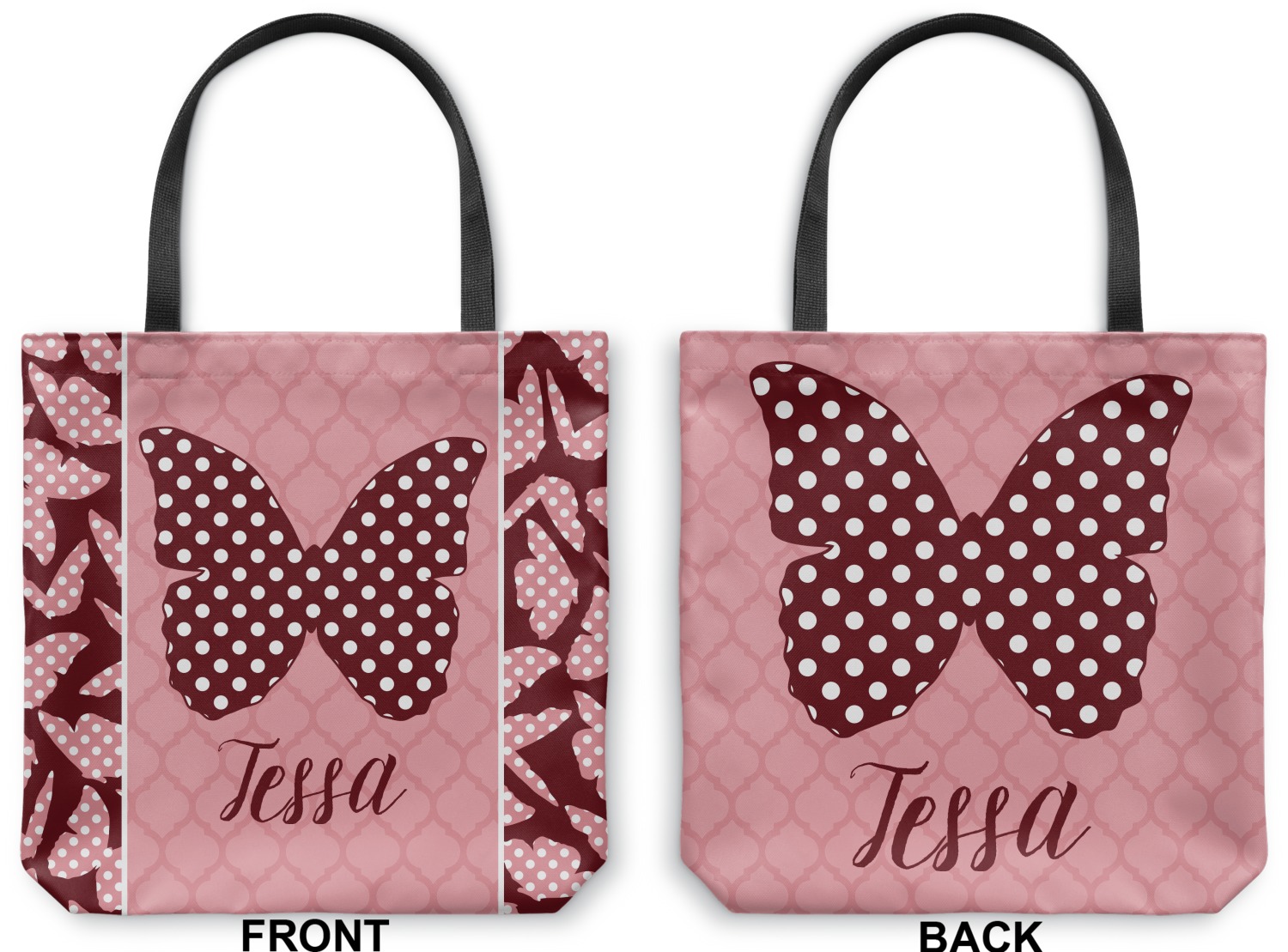 The design is split up in three parts with a polka dot butterfly pattern on either side of the middle section which has a subtle moroccan background. The foreground is personalized with a name and a fun polka dotted butterfly graphic above it. The blush and maroon compliment each other quite nicely. Easily change any of these design elements within the design center.