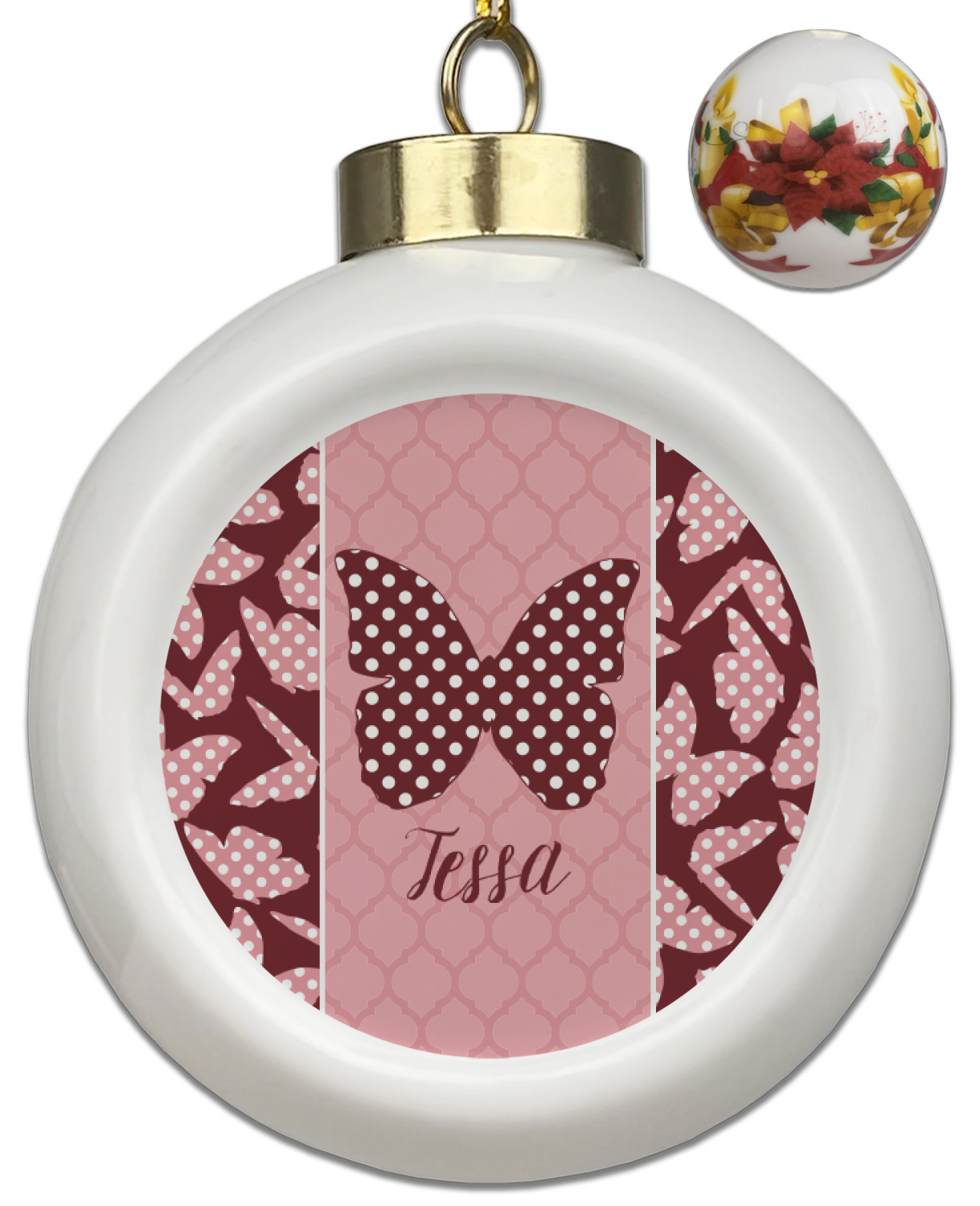 Our Christmas ornaments are a unique ceramic ball shape with a twist as it has a flat face to display your custom design! Select from one of our two design types - Christmas Tree or Poinsettia Garland - to adorn the curved back of your personal design. Each ornament measures 3H x 2.5W x 2D accompanied with a gold string accent for finishing touches to hang on your beautiful Christmas tree!