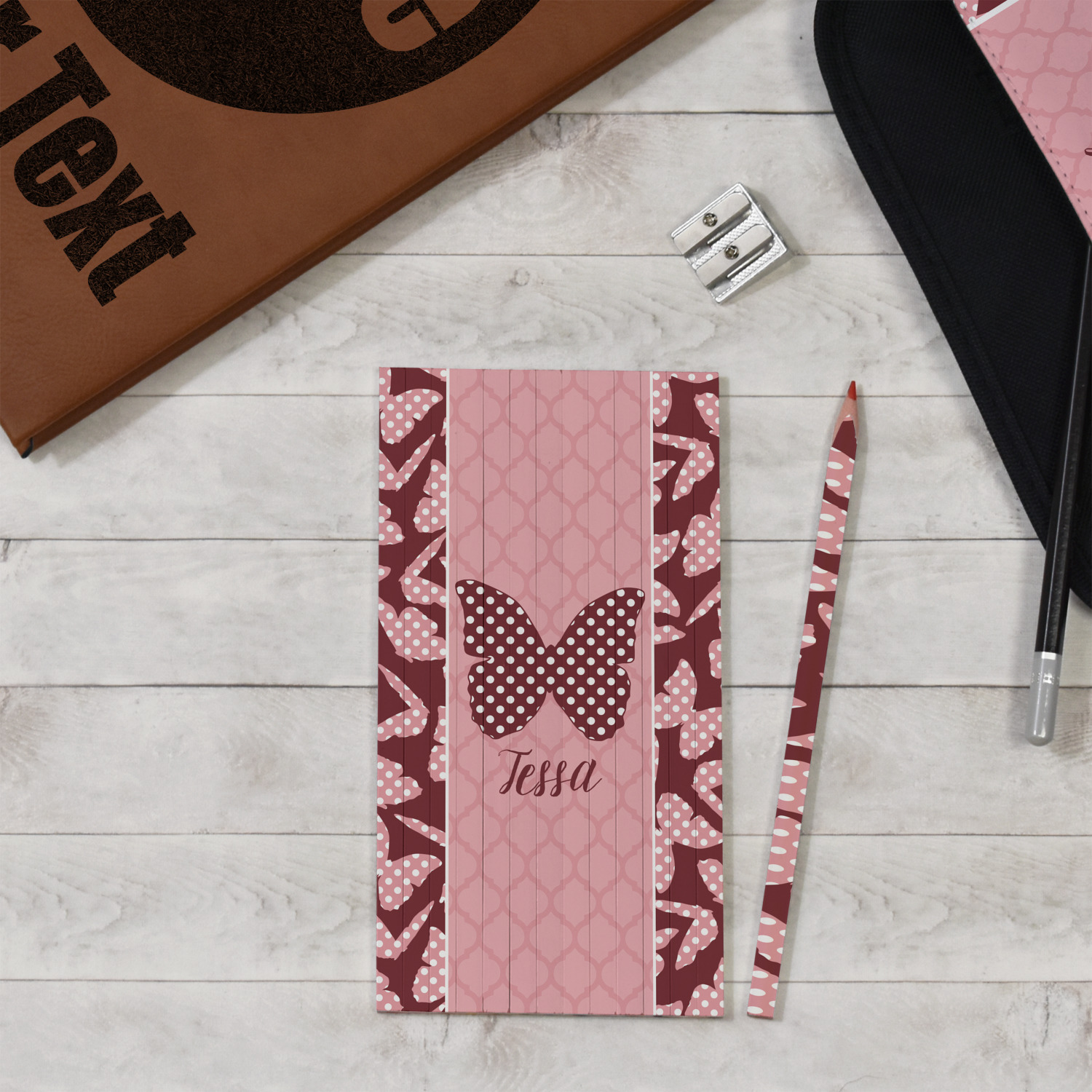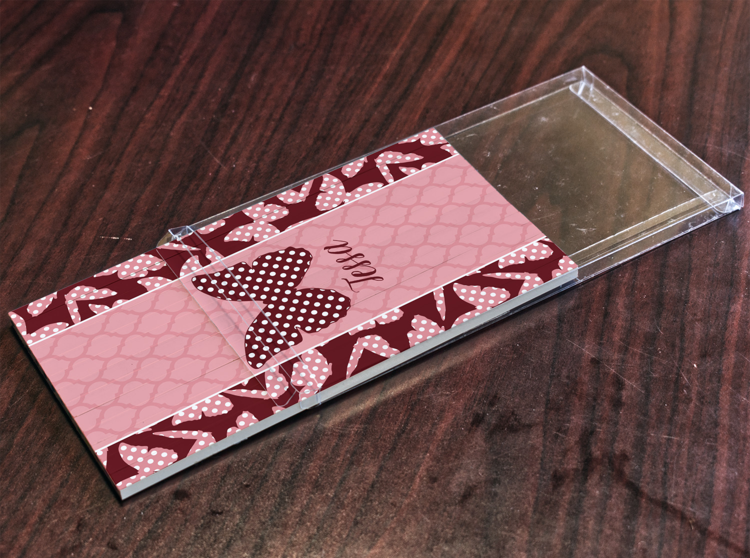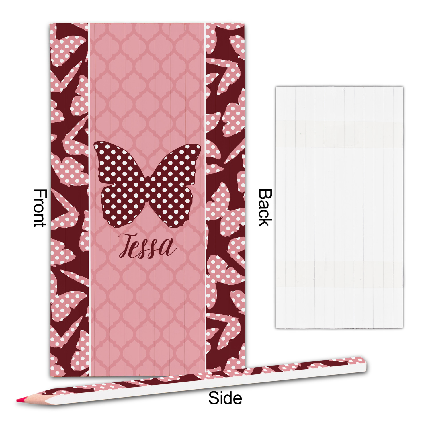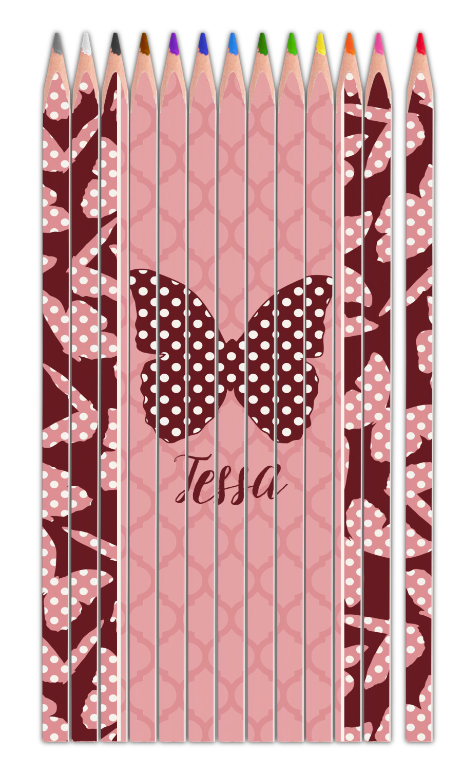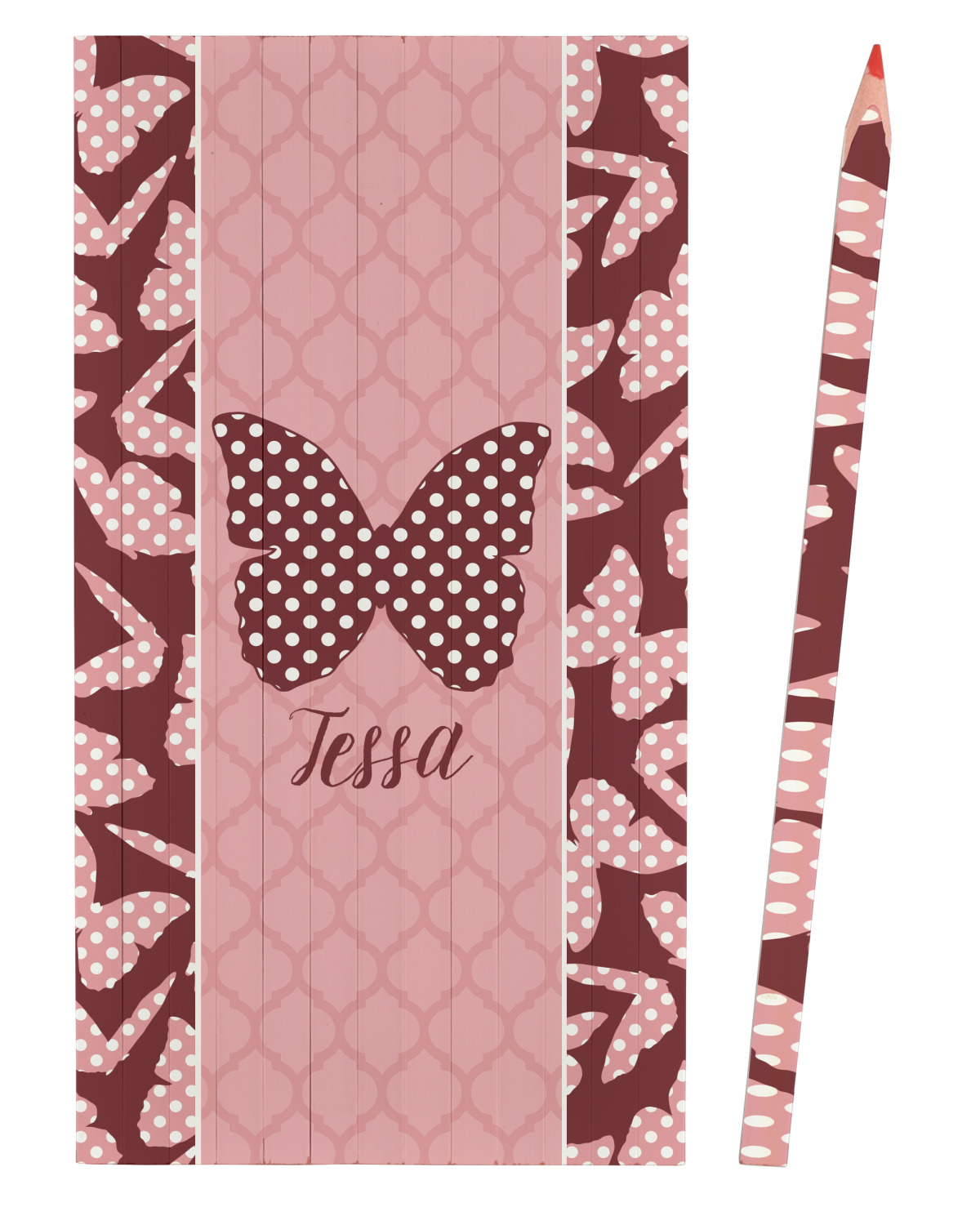 The design is split up in three parts with a polka dot butterfly pattern on either side of the middle section which has a subtle moroccan background. The foreground is personalized with a name and a fun polka dotted butterfly graphic above it. The blush and maroon compliment each other quite nicely. Easily change any of these design elements within the design center.