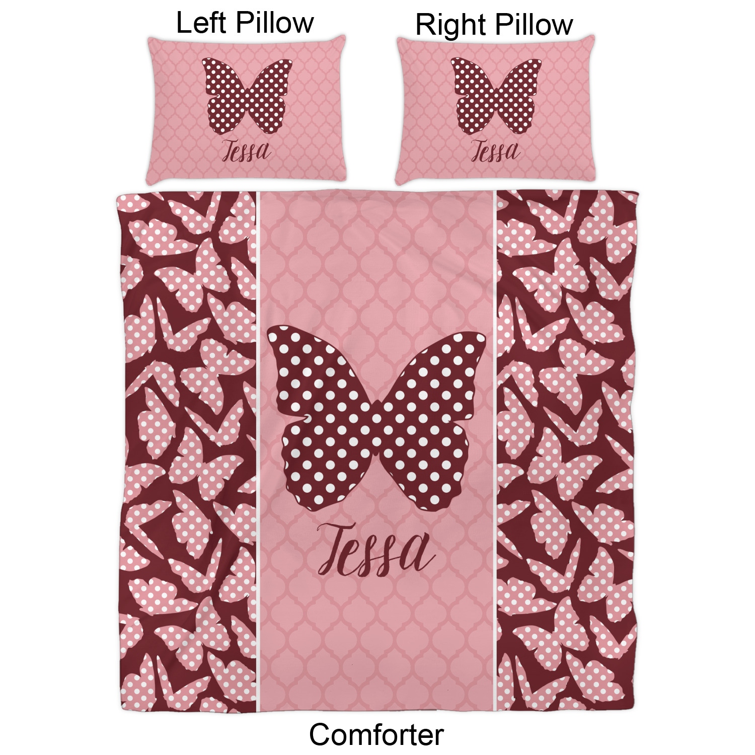 The design is split up in three parts with a polka dot butterfly pattern on either side of the middle section which has a subtle moroccan background. The foreground is personalized with a name and a fun polka dotted butterfly graphic above it. The blush and maroon compliment each other quite nicely. Easily change any of these design elements within the design center.