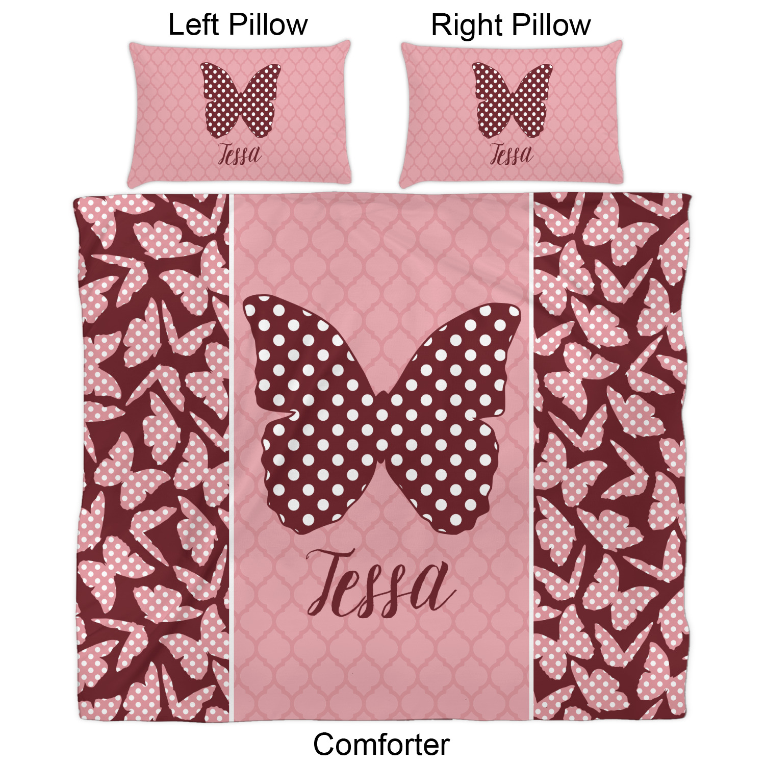 The design is split up in three parts with a polka dot butterfly pattern on either side of the middle section which has a subtle moroccan background. The foreground is personalized with a name and a fun polka dotted butterfly graphic above it. The blush and maroon compliment each other quite nicely. Easily change any of these design elements within the design center.