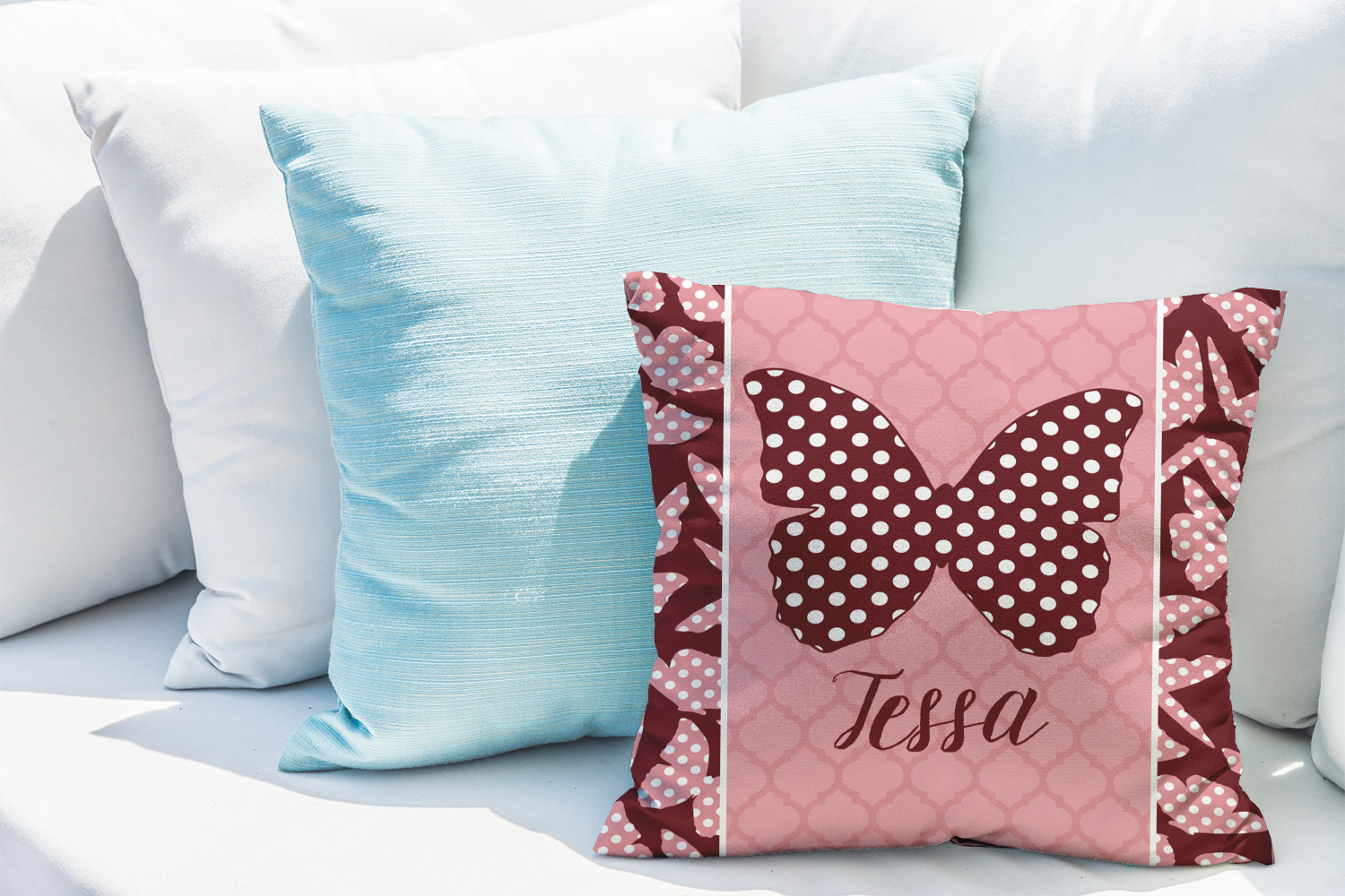 The design is split up in three parts with a polka dot butterfly pattern on either side of the middle section which has a subtle moroccan background. The foreground is personalized with a name and a fun polka dotted butterfly graphic above it. The blush and maroon compliment each other quite nicely. Easily change any of these design elements within the design center.