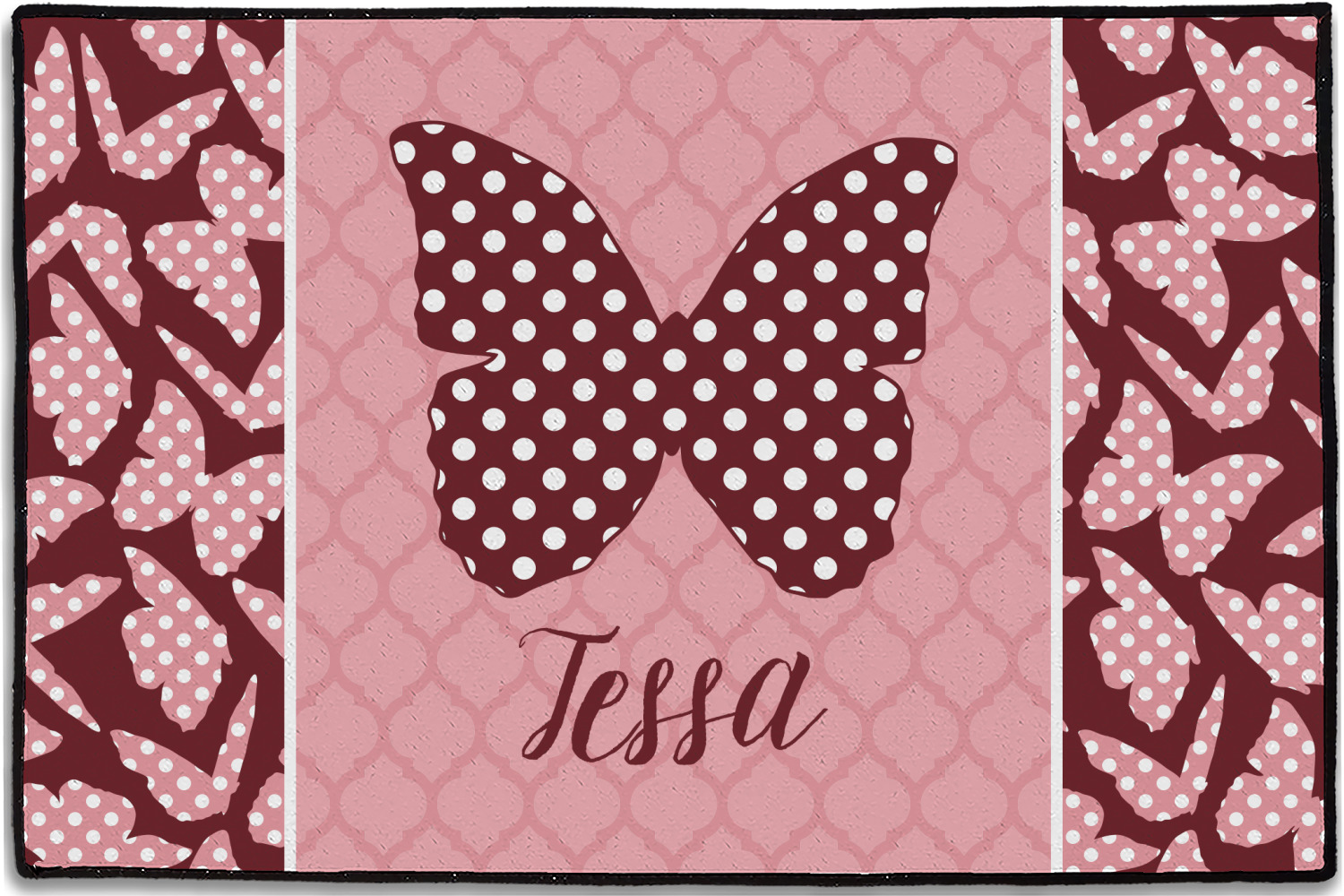 The design is split up in three parts with a polka dot butterfly pattern on either side of the middle section which has a subtle moroccan background. The foreground is personalized with a name and a fun polka dotted butterfly graphic above it. The blush and maroon compliment each other quite nicely. Easily change any of these design elements within the design center.