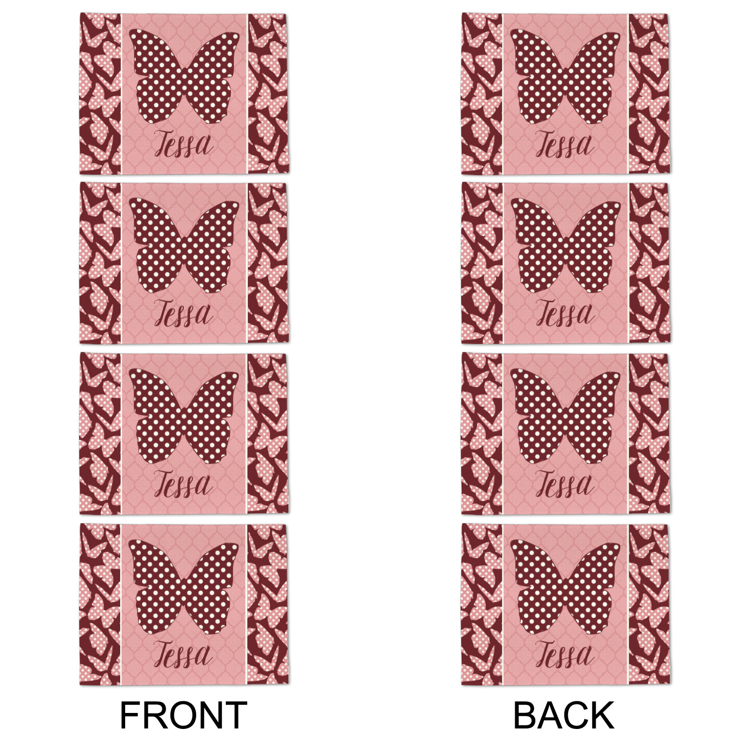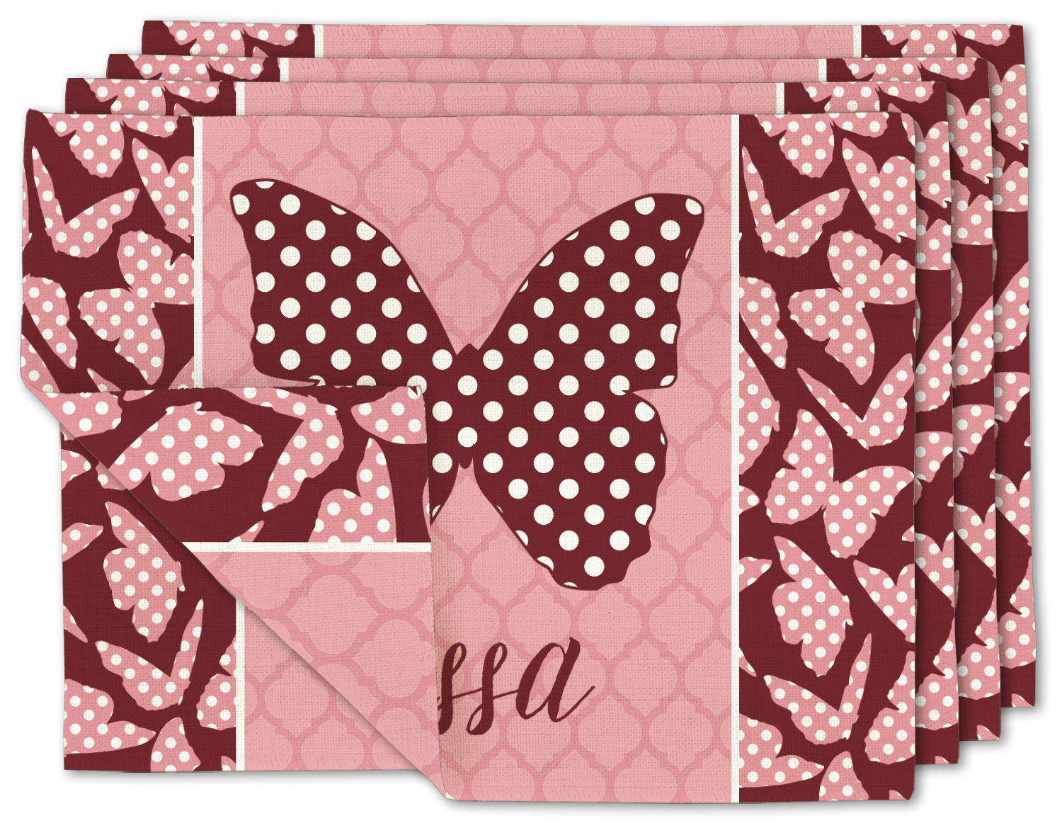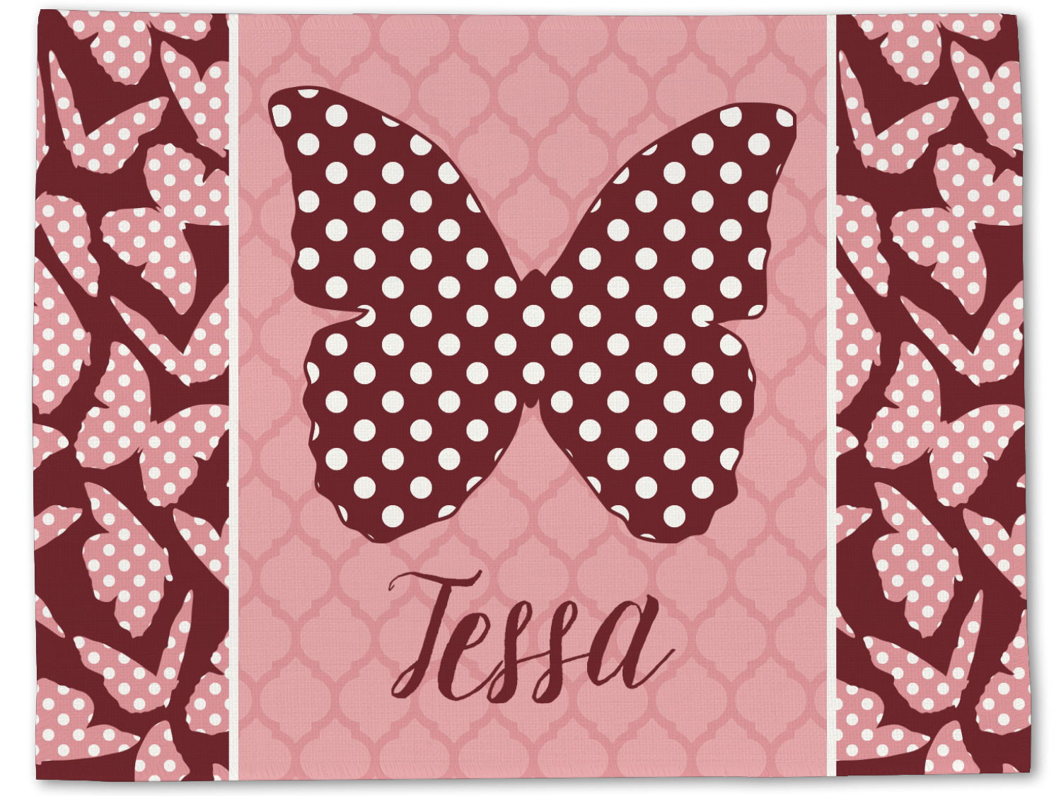The design is split up in three parts with a polka dot butterfly pattern on either side of the middle section which has a subtle moroccan background. The foreground is personalized with a name and a fun polka dotted butterfly graphic above it. The blush and maroon compliment each other quite nicely. Easily change any of these design elements within the design center.