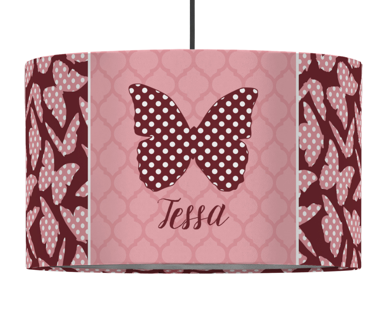 The design is split up in three parts with a polka dot butterfly pattern on either side of the middle section which has a subtle moroccan background. The foreground is personalized with a name and a fun polka dotted butterfly graphic above it. The blush and maroon compliment each other quite nicely. Easily change any of these design elements within the design center.