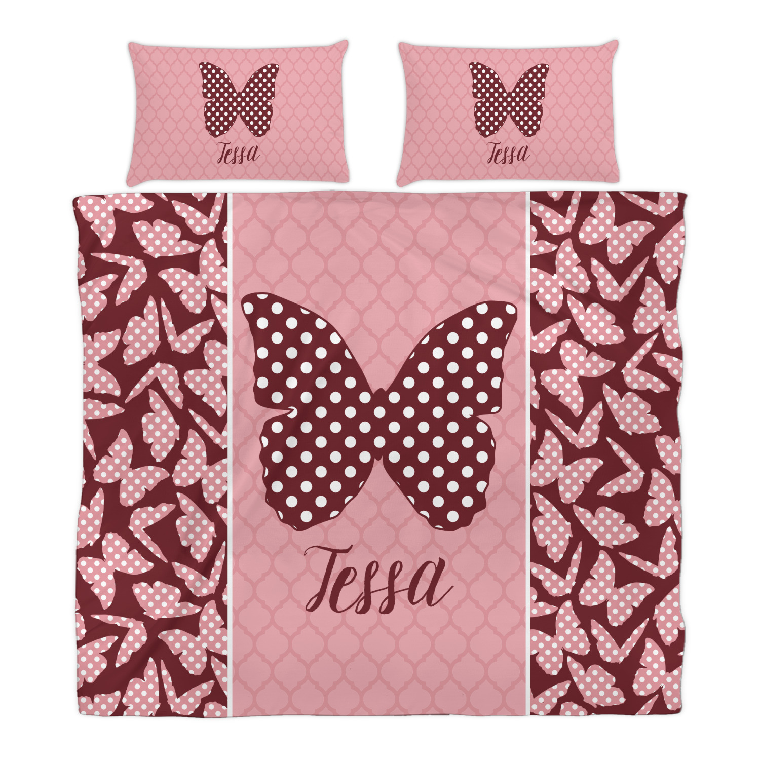 The design is split up in three parts with a polka dot butterfly pattern on either side of the middle section which has a subtle moroccan background. The foreground is personalized with a name and a fun polka dotted butterfly graphic above it. The blush and maroon compliment each other quite nicely. Easily change any of these design elements within the design center.