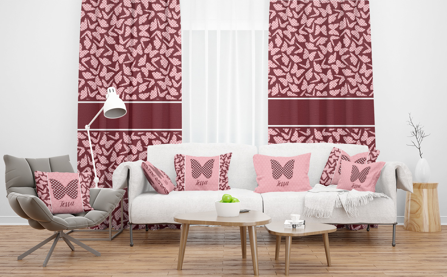 The design is split up in three parts with a polka dot butterfly pattern on either side of the middle section which has a subtle moroccan background. The foreground is personalized with a name and a fun polka dotted butterfly graphic above it. The blush and maroon compliment each other quite nicely. Easily change any of these design elements within the design center.