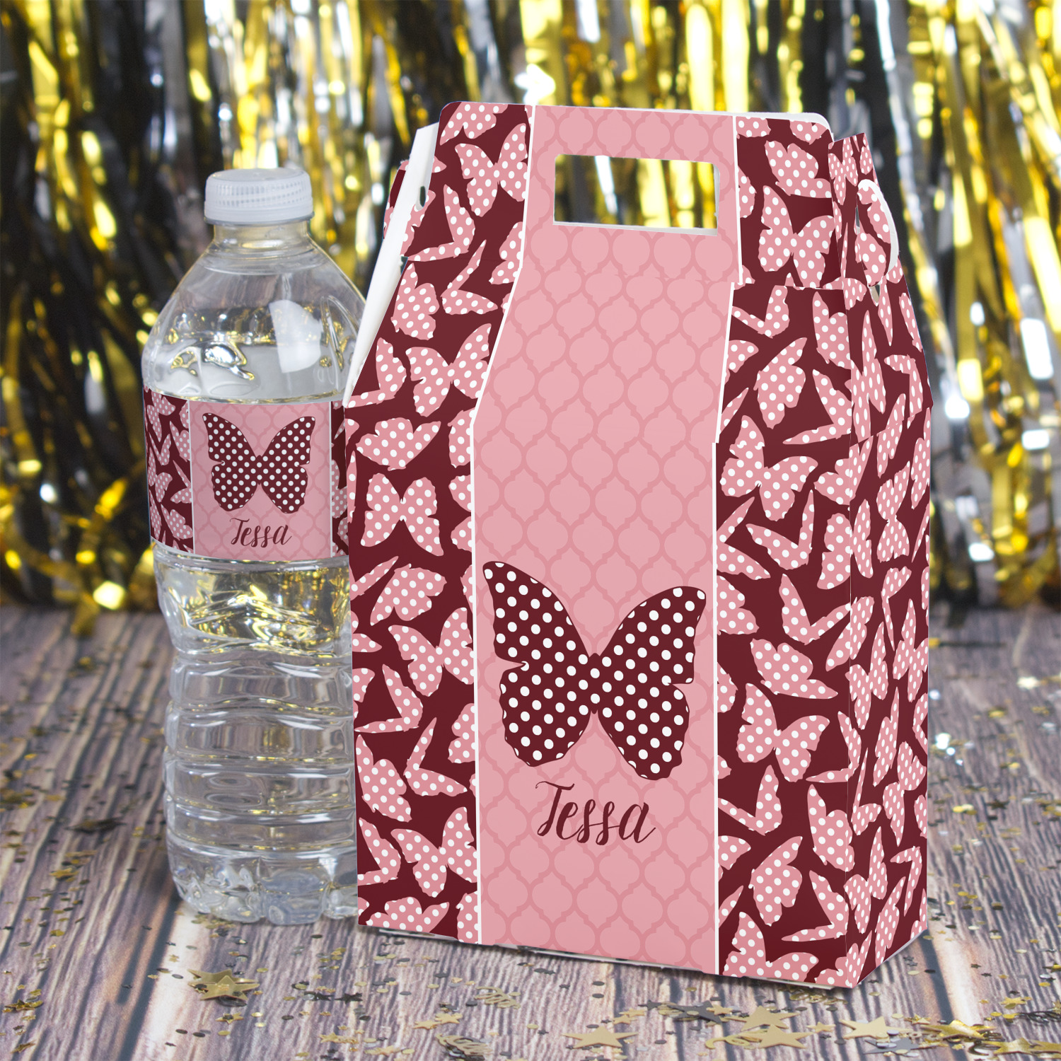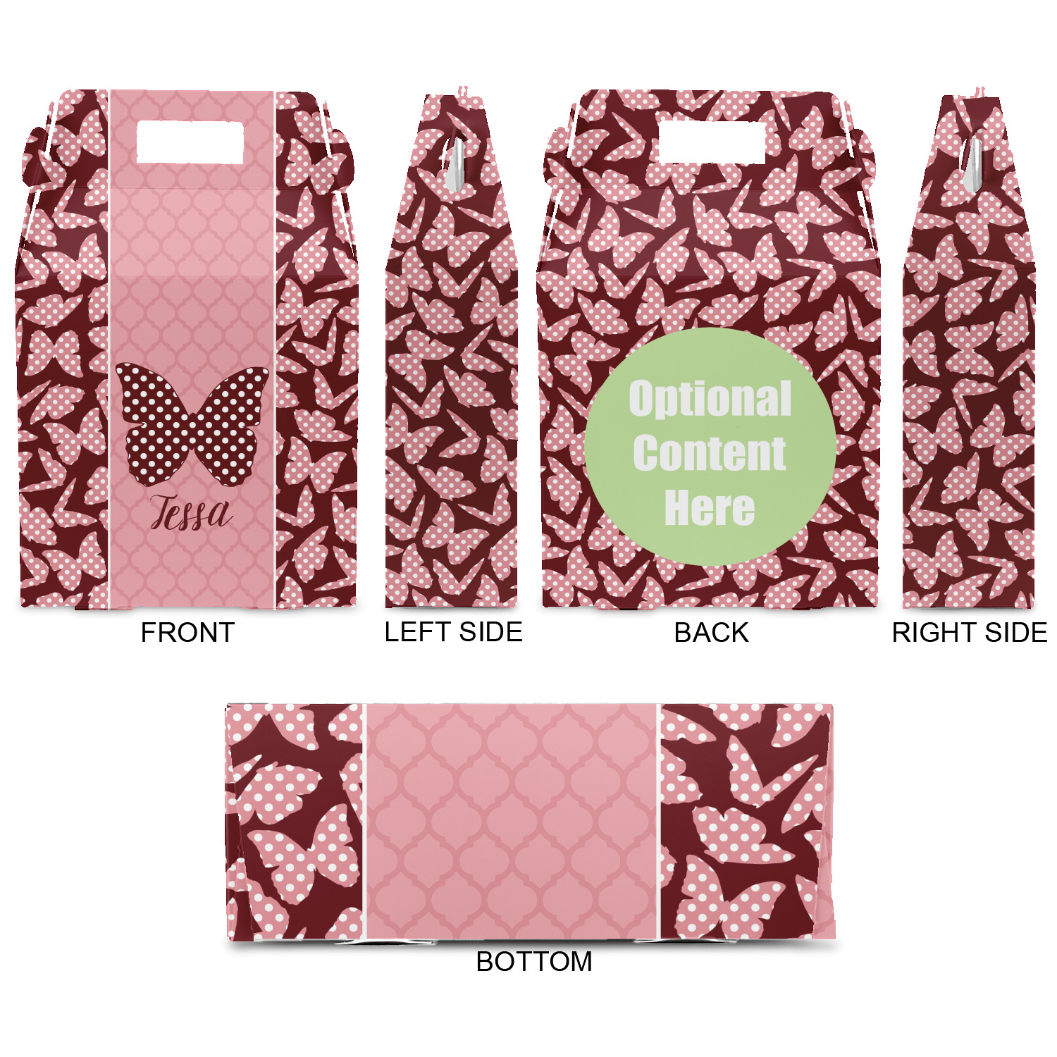 The design is split up in three parts with a polka dot butterfly pattern on either side of the middle section which has a subtle moroccan background. The foreground is personalized with a name and a fun polka dotted butterfly graphic above it. The blush and maroon compliment each other quite nicely. Easily change any of these design elements within the design center.