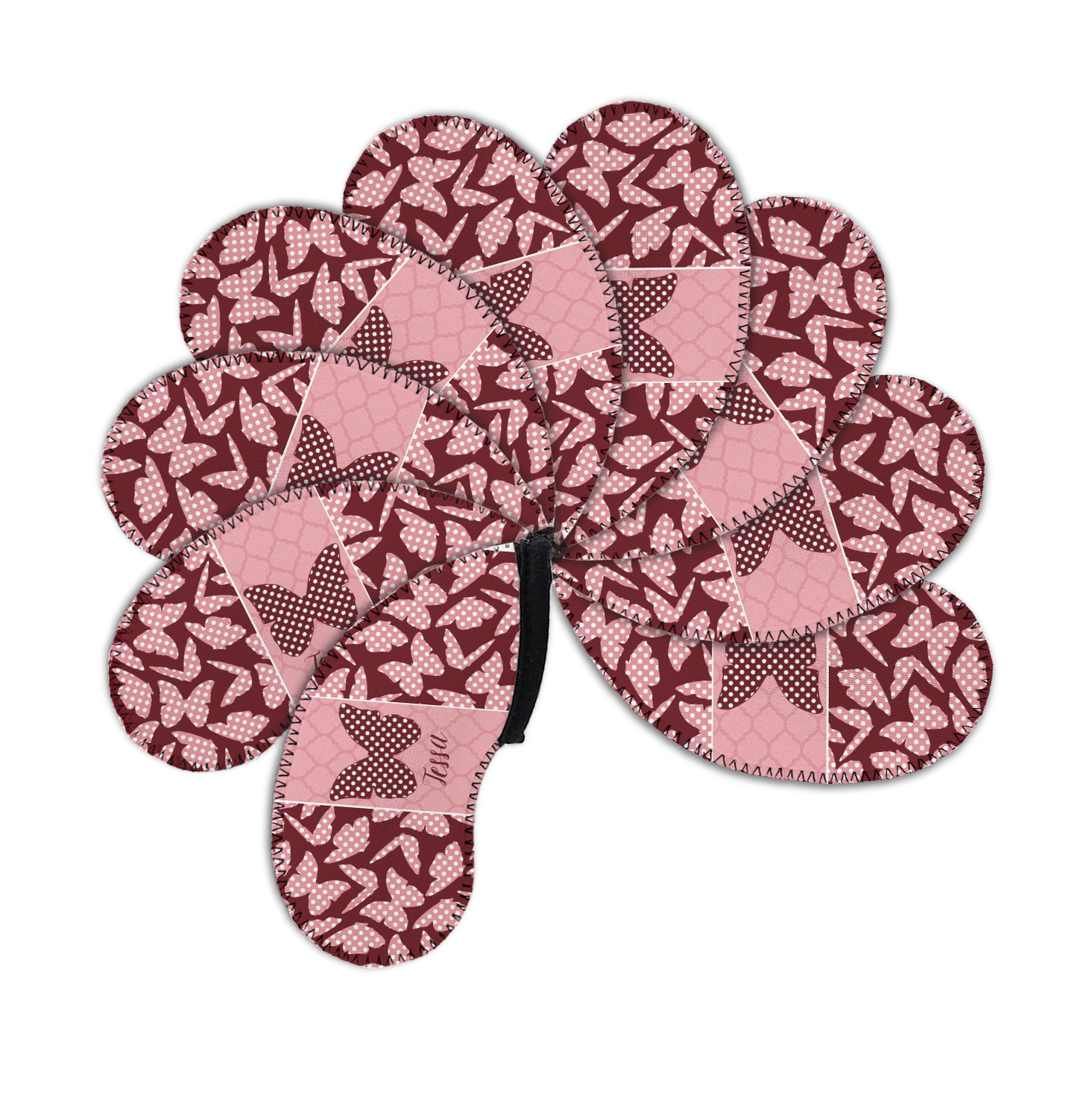 The design is split up in three parts with a polka dot butterfly pattern on either side of the middle section which has a subtle moroccan background. The foreground is personalized with a name and a fun polka dotted butterfly graphic above it. The blush and maroon compliment each other quite nicely. Easily change any of these design elements within the design center.