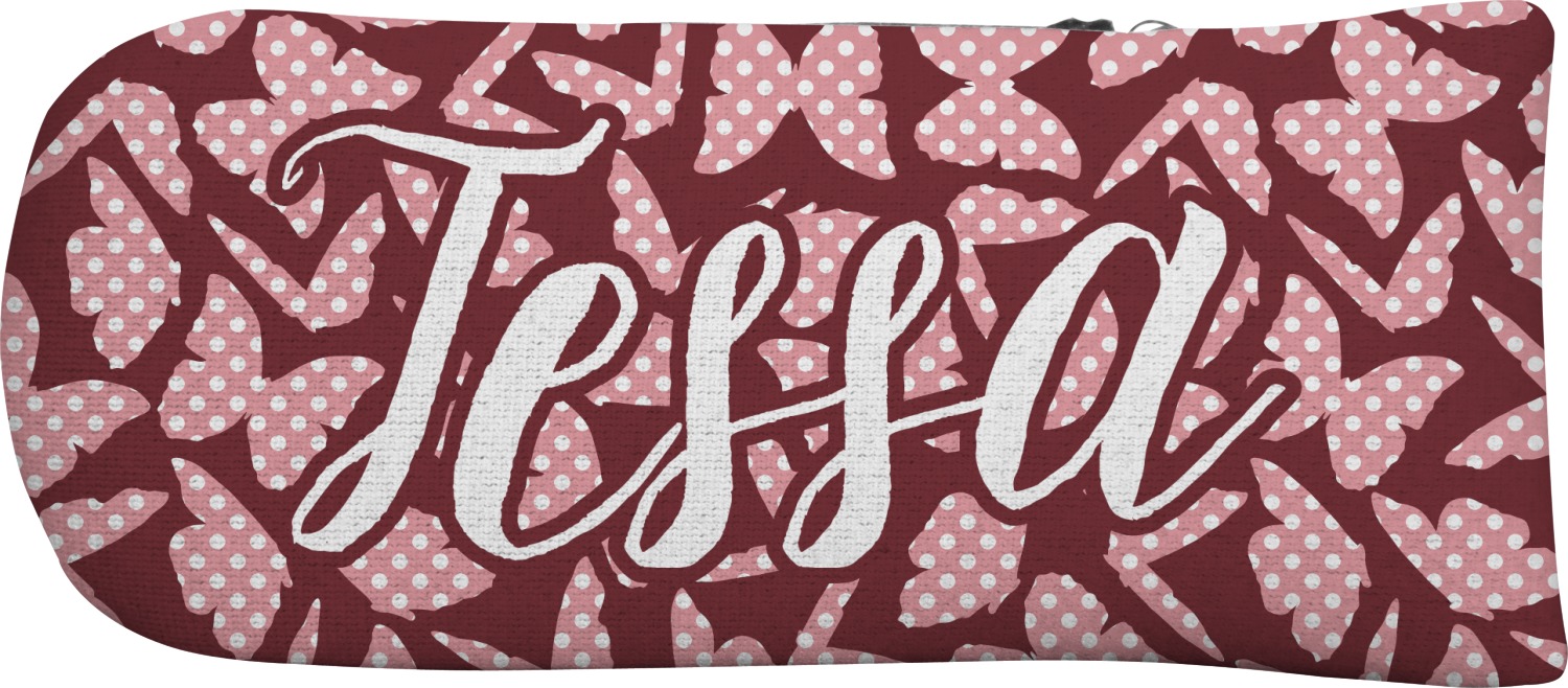 The design is split up in three parts with a polka dot butterfly pattern on either side of the middle section which has a subtle moroccan background. The foreground is personalized with a name and a fun polka dotted butterfly graphic above it. The blush and maroon compliment each other quite nicely. Easily change any of these design elements within the design center.