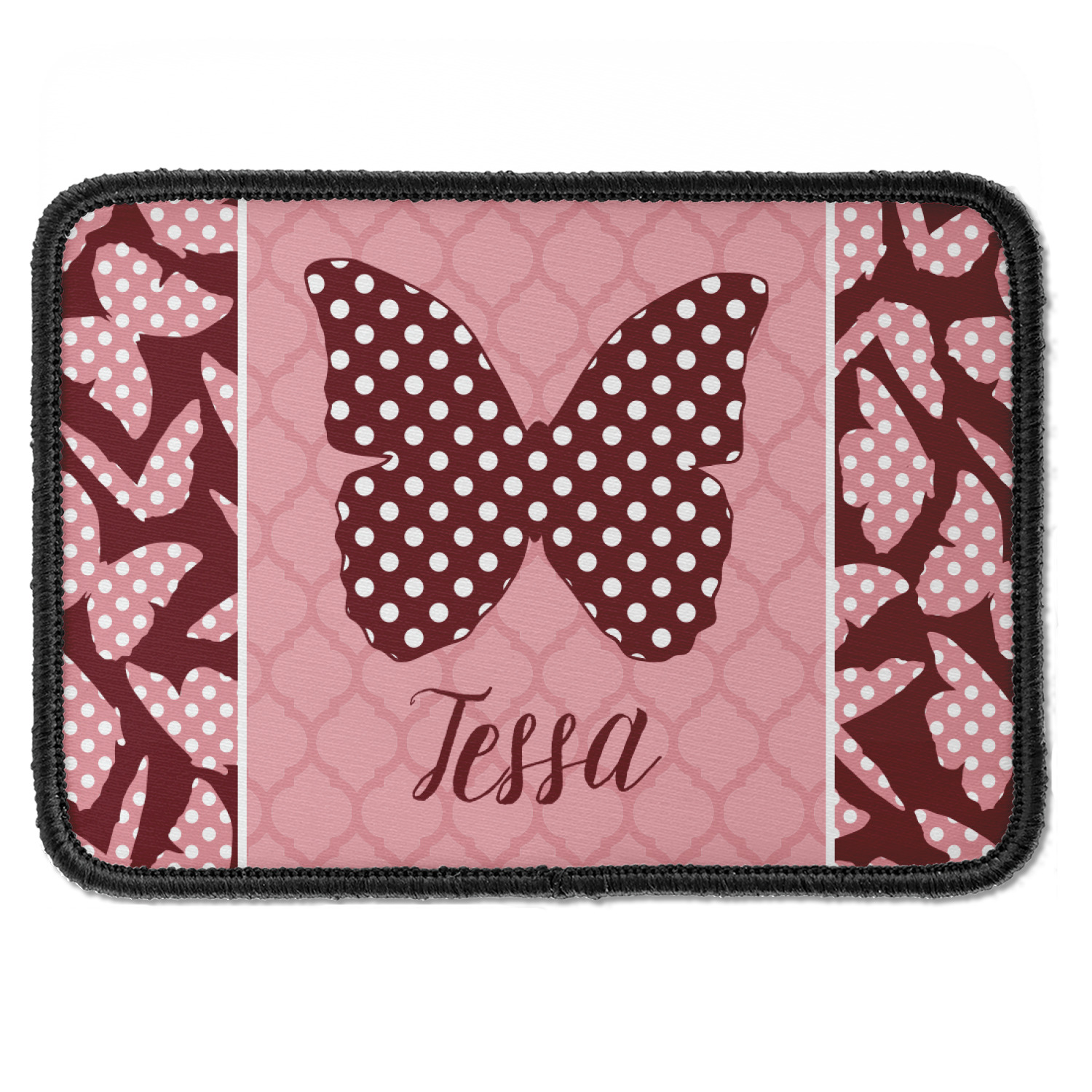 The design is split up in three parts with a polka dot butterfly pattern on either side of the middle section which has a subtle moroccan background. The foreground is personalized with a name and a fun polka dotted butterfly graphic above it. The blush and maroon compliment each other quite nicely. Easily change any of these design elements within the design center.