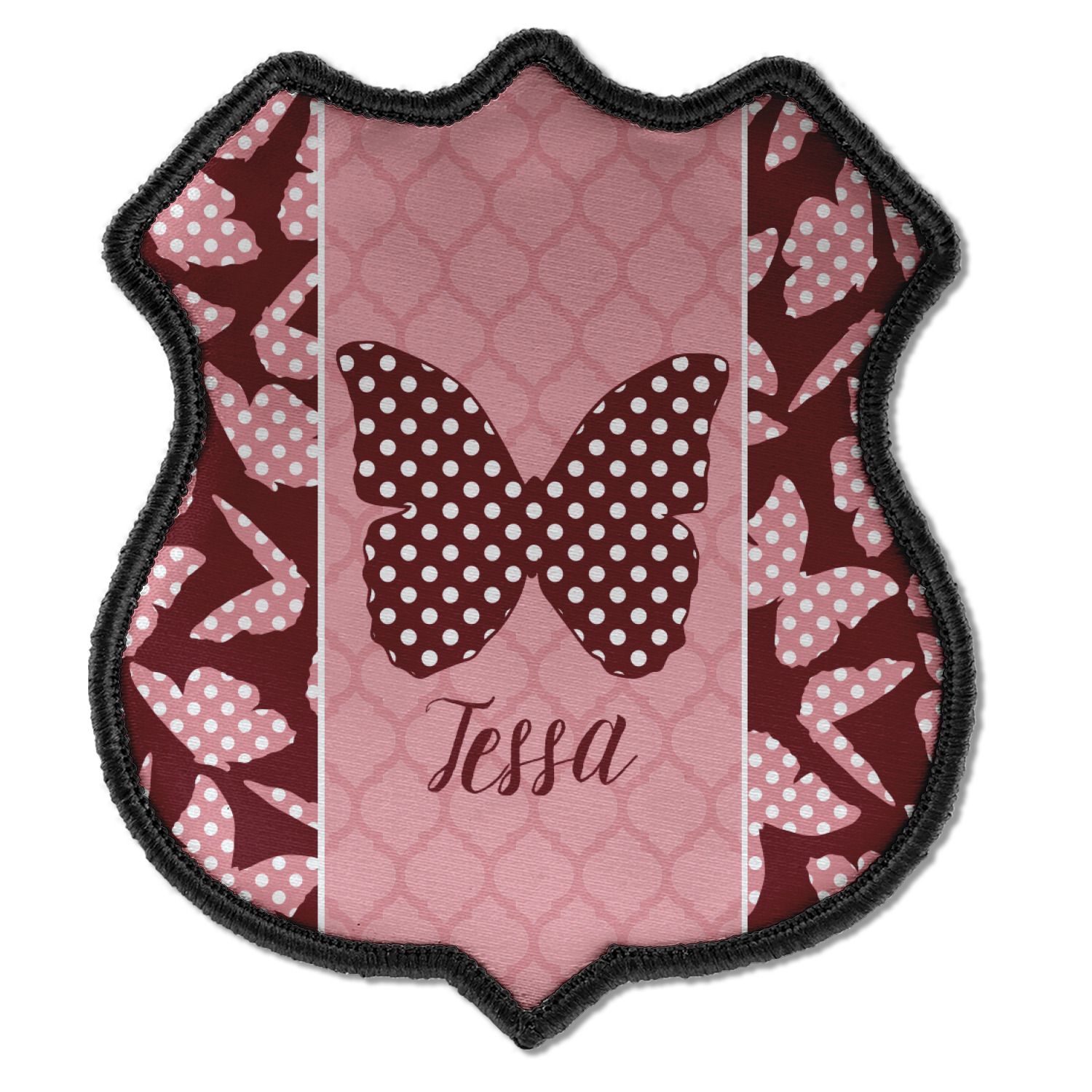 The design is split up in three parts with a polka dot butterfly pattern on either side of the middle section which has a subtle moroccan background. The foreground is personalized with a name and a fun polka dotted butterfly graphic above it. The blush and maroon compliment each other quite nicely. Easily change any of these design elements within the design center.