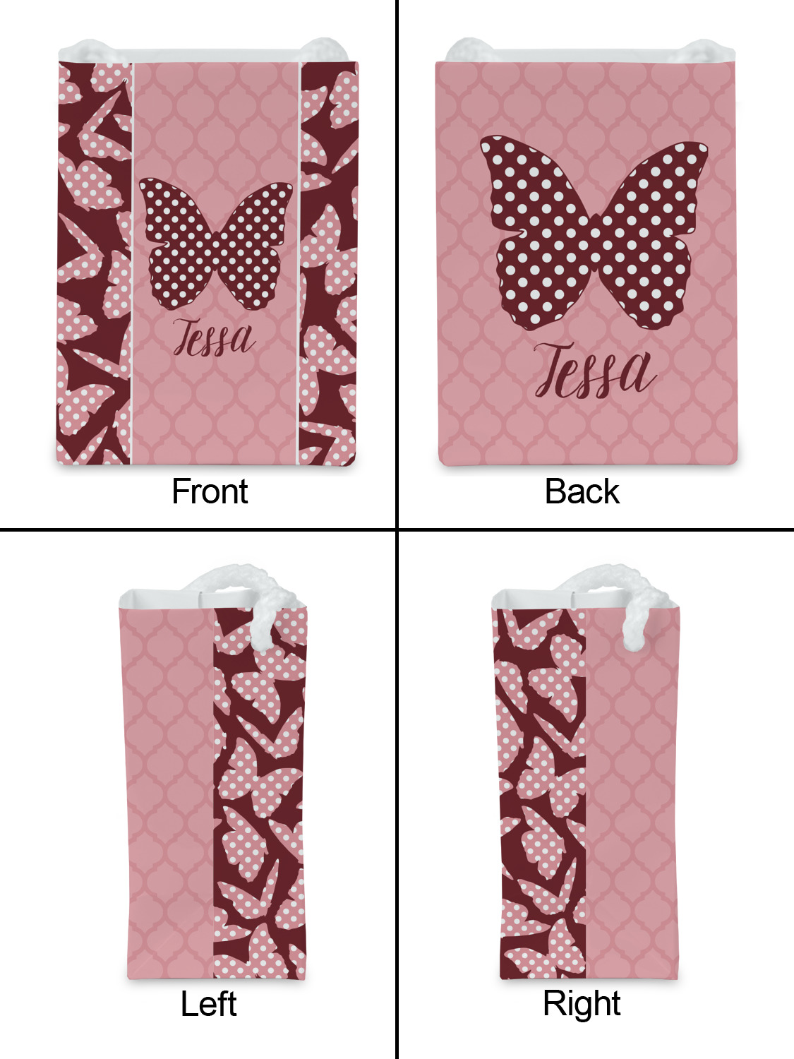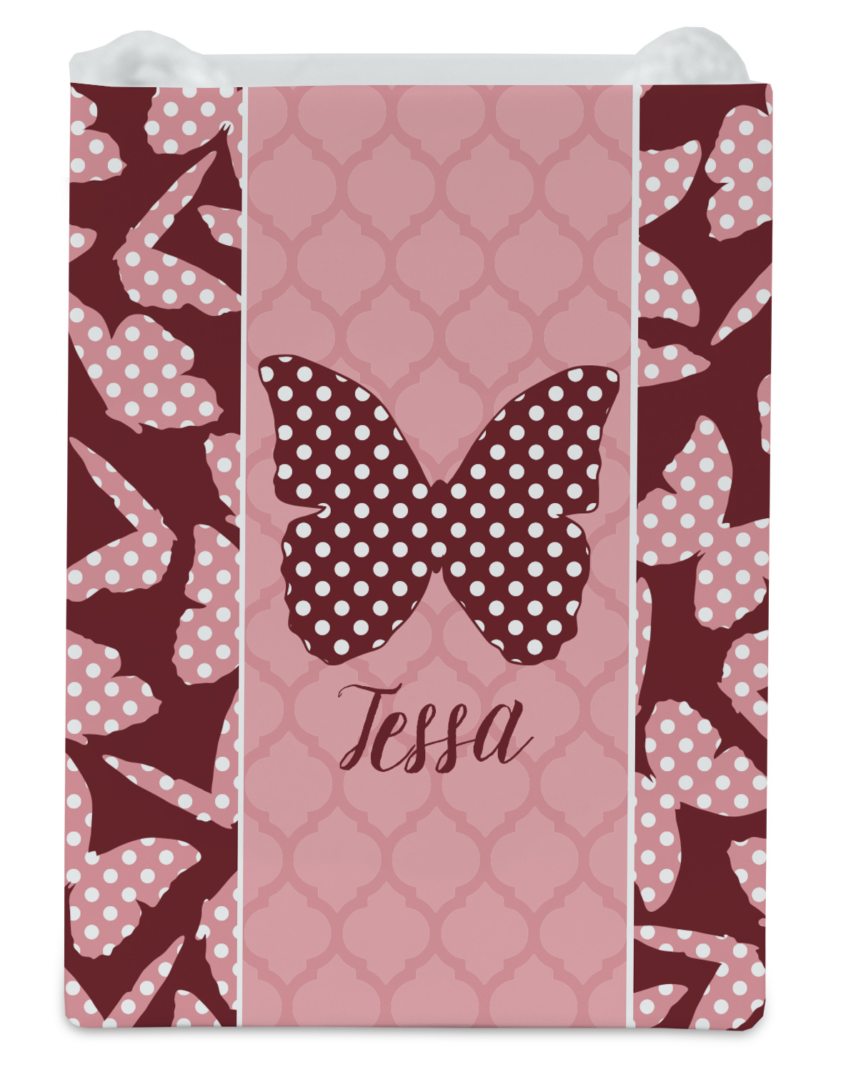 The design is split up in three parts with a polka dot butterfly pattern on either side of the middle section which has a subtle moroccan background. The foreground is personalized with a name and a fun polka dotted butterfly graphic above it. The blush and maroon compliment each other quite nicely. Easily change any of these design elements within the design center.