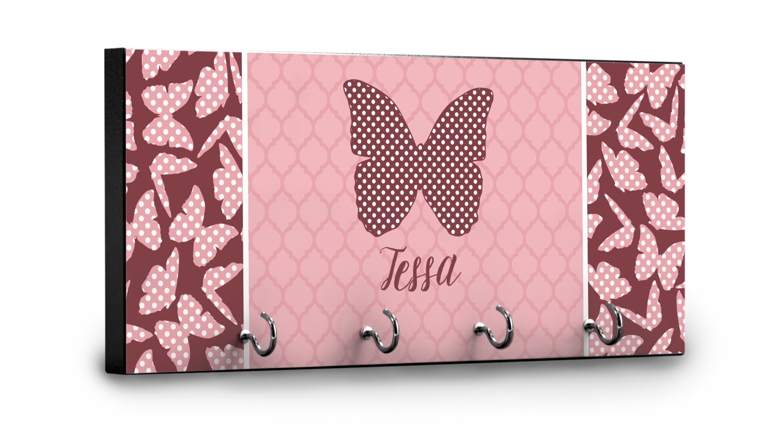 The design is split up in three parts with a polka dot butterfly pattern on either side of the middle section which has a subtle moroccan background. The foreground is personalized with a name and a fun polka dotted butterfly graphic above it. The blush and maroon compliment each other quite nicely. Easily change any of these design elements within the design center.