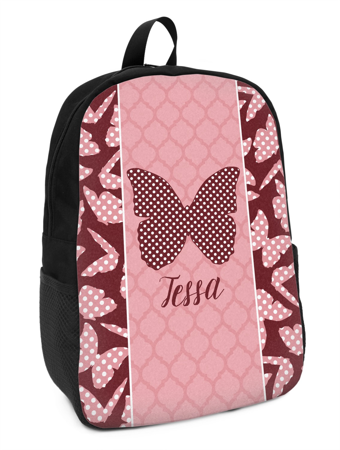 The design is split up in three parts with a polka dot butterfly pattern on either side of the middle section which has a subtle moroccan background. The foreground is personalized with a name and a fun polka dotted butterfly graphic above it. The blush and maroon compliment each other quite nicely. Easily change any of these design elements within the design center.