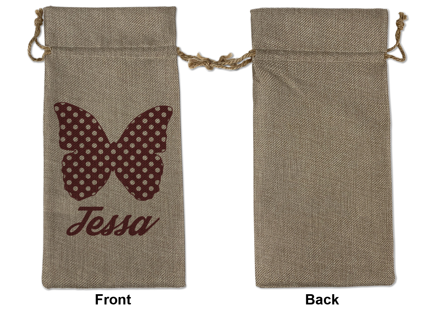 We sell our Burlap Gift Bags in 3 variant sized bags. Made with burlap polyester, each personalized bag can be secured with a twine drawstring pull. Your custom design is available to print on one side or both sides - completely up to you! The sizes of the bags measure approximately 4.5" x 6.5" for the smallest size, 6.5" x 8.0" for the medium size, and 6.5" x 13.5" for the large-sized bag.