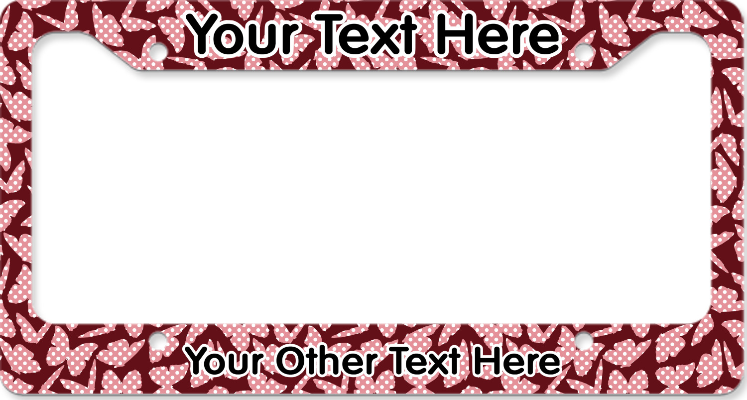 Each customizable license plate frame is made from a fine, yet sturdy aluminum material that measures approximately 6.5 x 12.15 inches, accommodating most standard license plates. The thickness allows the license plate frame to adhere completely to your license plate for a seamless look. We carry 3 styles of license plate frames to customize - Style A has texts on top and bottom, Style B offers texts on top and bottom as well as a full fill bottom border, and Style C offers text at the bottom only. The personalized license plate frame comes with four mounting holes for easy installation! We print each custom design across the frame with a glossy finish.