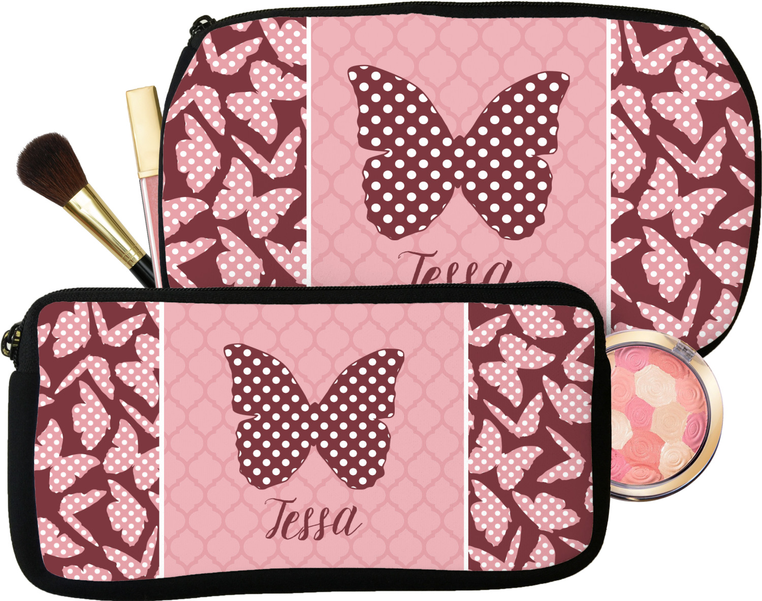 Our personalized makeup bags are available in many different designs, patterns and colors - so you are sure to find one that will love. They are made of neoprene (same material as wet-suits) and thus are water resistant, so spillages in your makeup bag will not end up all over you purse. They are customized on one side and are black on the other side and the zipper is black as well.