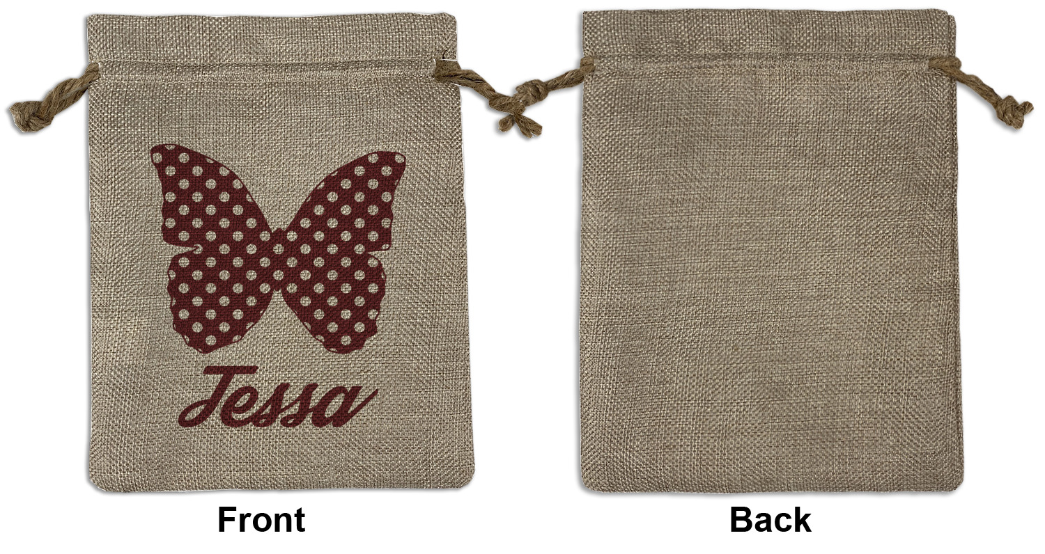 We sell our Burlap Gift Bags in 3 variant sized bags. Made with burlap polyester, each personalized bag can be secured with a twine drawstring pull. Your custom design is available to print on one side or both sides - completely up to you! The sizes of the bags measure approximately 4.5" x 6.5" for the smallest size, 6.5" x 8.0" for the medium size, and 6.5" x 13.5" for the large-sized bag.