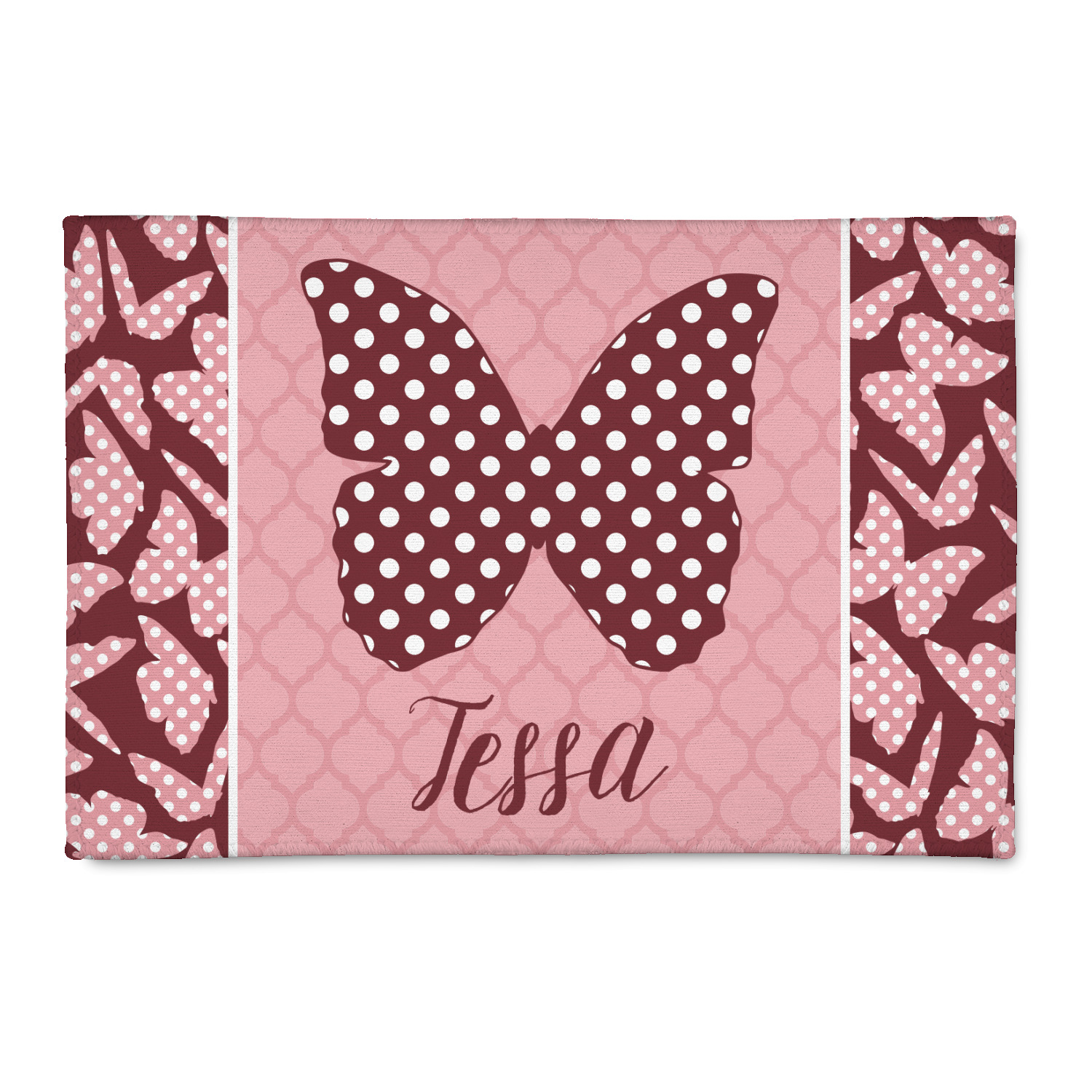 The design is split up in three parts with a polka dot butterfly pattern on either side of the middle section which has a subtle moroccan background. The foreground is personalized with a name and a fun polka dotted butterfly graphic above it. The blush and maroon compliment each other quite nicely. Easily change any of these design elements within the design center.