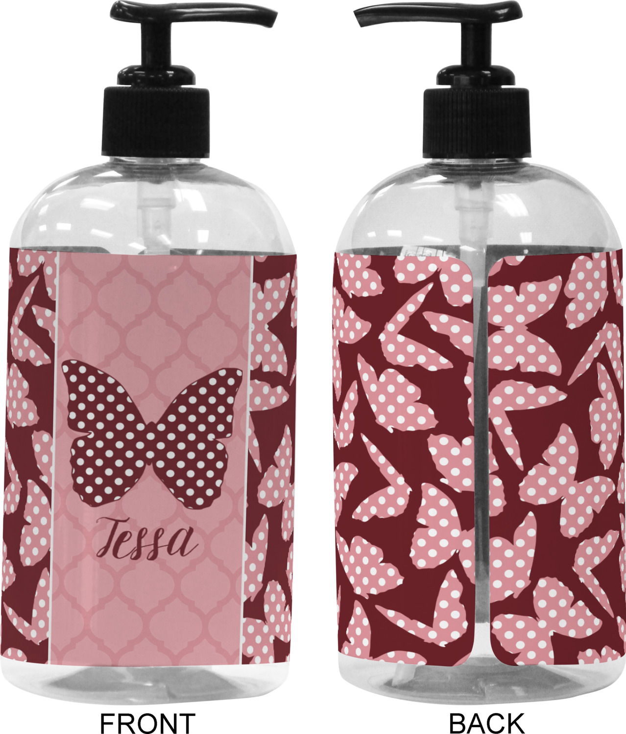 The design is split up in three parts with a polka dot butterfly pattern on either side of the middle section which has a subtle moroccan background. The foreground is personalized with a name and a fun polka dotted butterfly graphic above it. The blush and maroon compliment each other quite nicely. Easily change any of these design elements within the design center.
