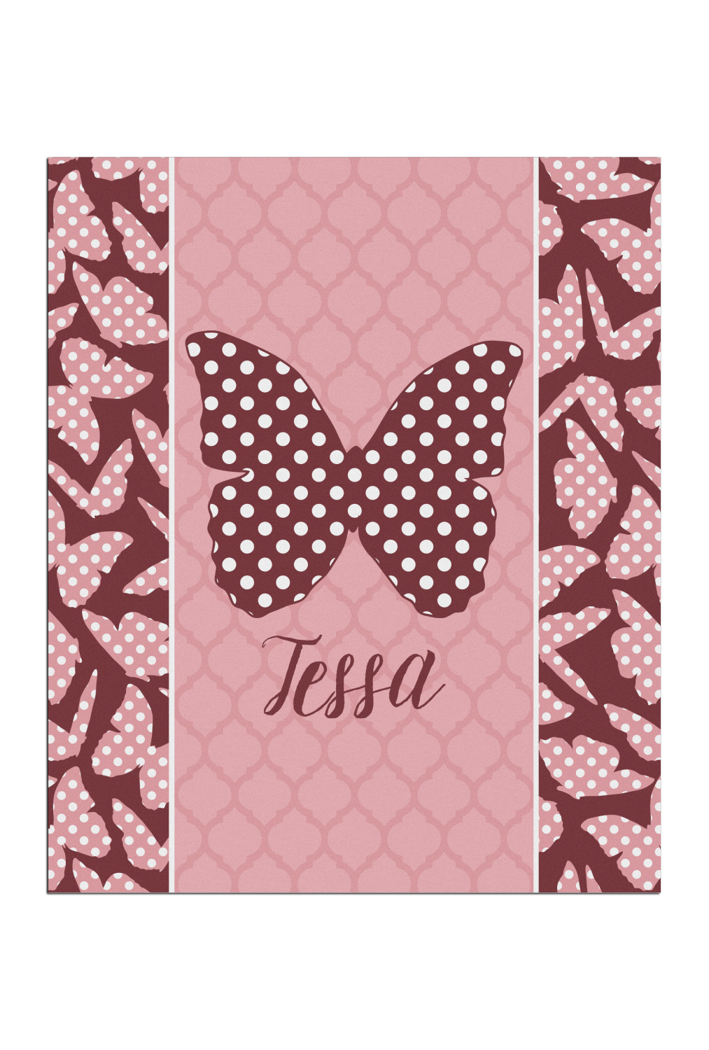 The design is split up in three parts with a polka dot butterfly pattern on either side of the middle section which has a subtle moroccan background. The foreground is personalized with a name and a fun polka dotted butterfly graphic above it. The blush and maroon compliment each other quite nicely. Easily change any of these design elements within the design center.