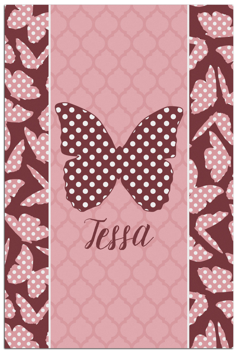 The design is split up in three parts with a polka dot butterfly pattern on either side of the middle section which has a subtle moroccan background. The foreground is personalized with a name and a fun polka dotted butterfly graphic above it. The blush and maroon compliment each other quite nicely. Easily change any of these design elements within the design center.