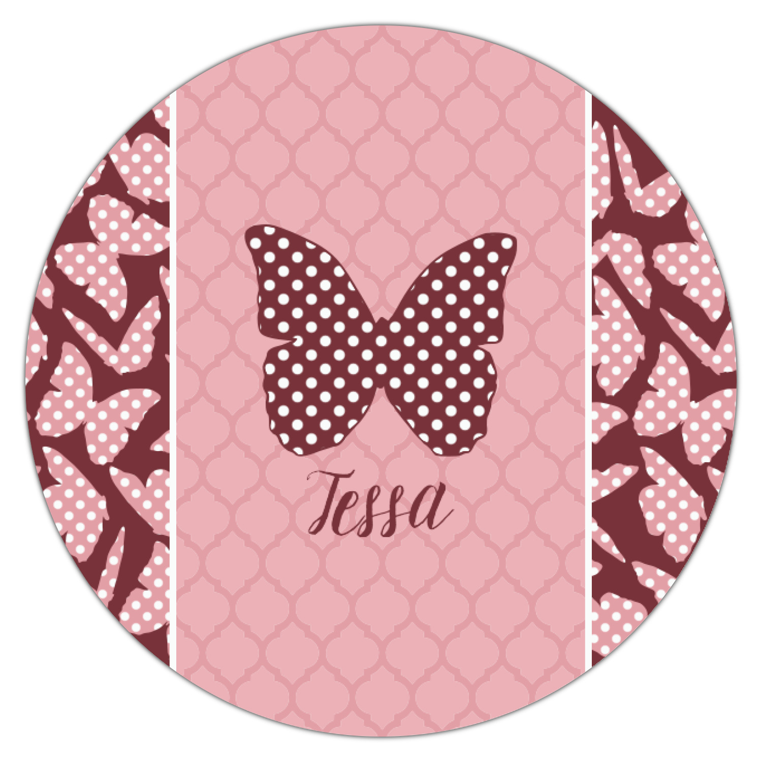 The design is split up in three parts with a polka dot butterfly pattern on either side of the middle section which has a subtle moroccan background. The foreground is personalized with a name and a fun polka dotted butterfly graphic above it. The blush and maroon compliment each other quite nicely. Easily change any of these design elements within the design center.