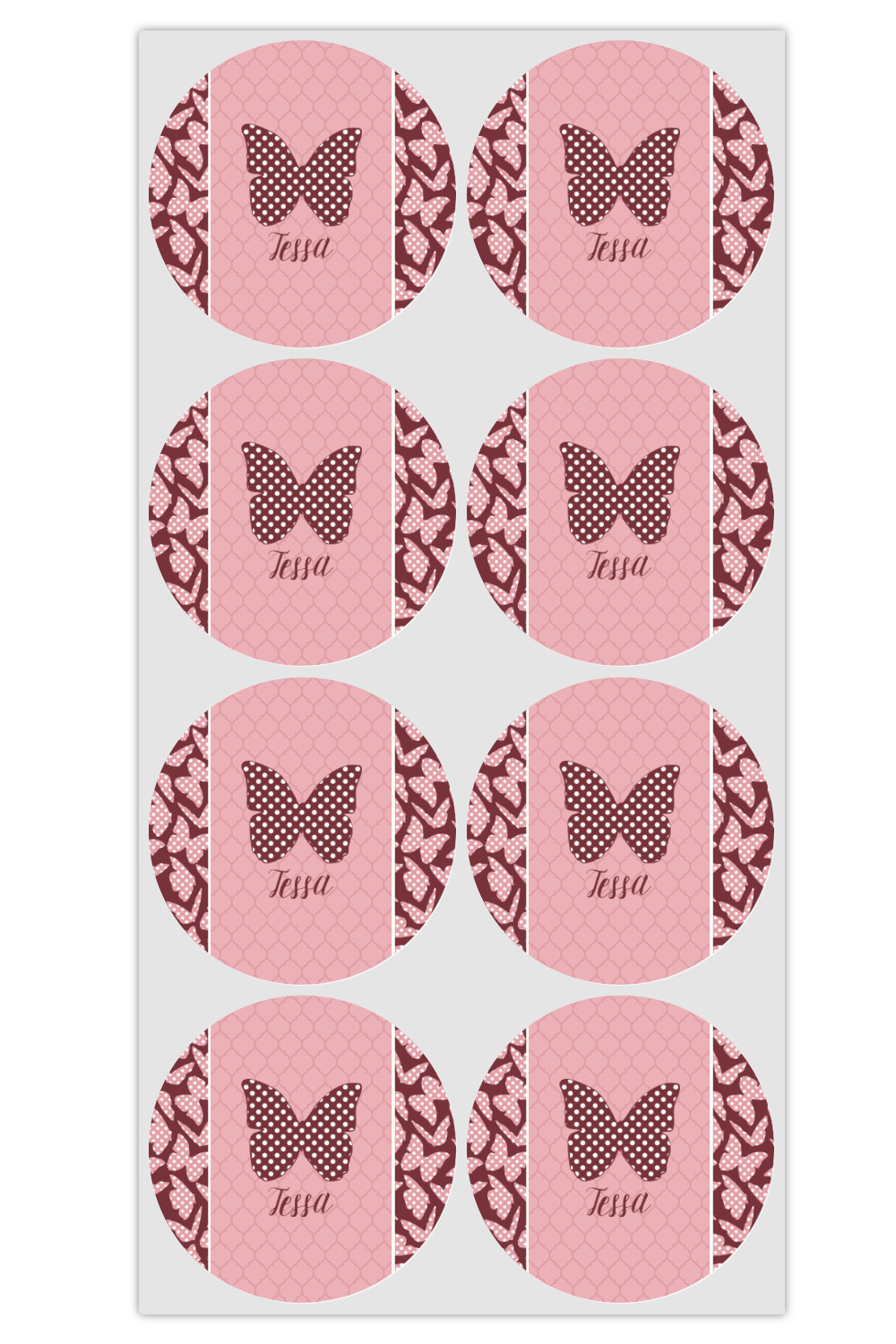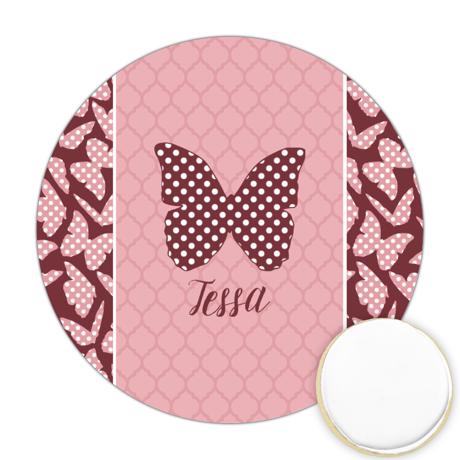 The design is split up in three parts with a polka dot butterfly pattern on either side of the middle section which has a subtle moroccan background. The foreground is personalized with a name and a fun polka dotted butterfly graphic above it. The blush and maroon compliment each other quite nicely. Easily change any of these design elements within the design center.