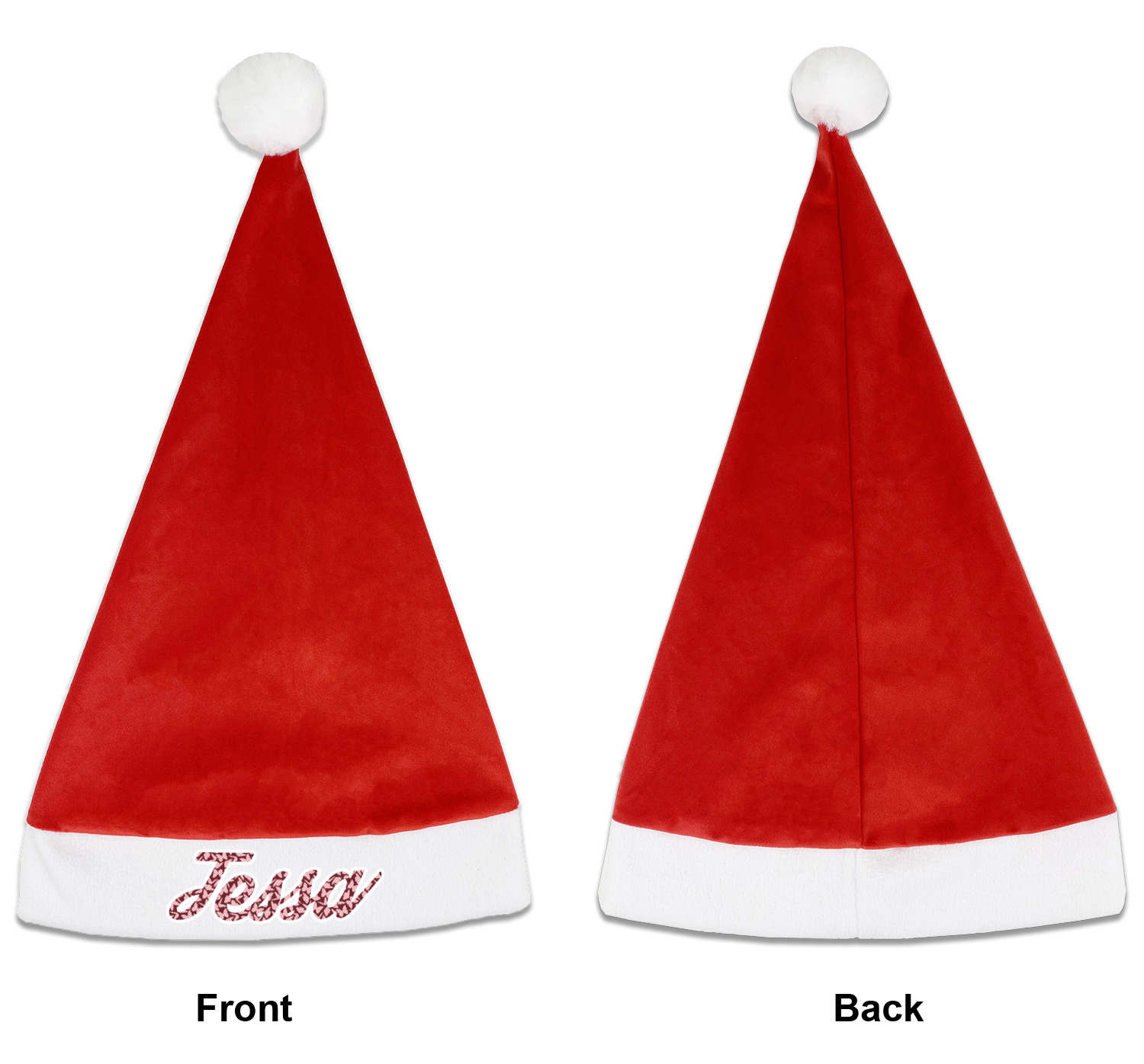 Our Santa hats are a soft, velvety polyester material. These customizable Santa hats are a classic red with white brimming and pom pom ball hanging off the hat tail just like Santa Claus! Each personalized Santa hat is approximately 17.5 L x 11.8 W. We offer two different styles to print your designs on the white brim - front or front & back.