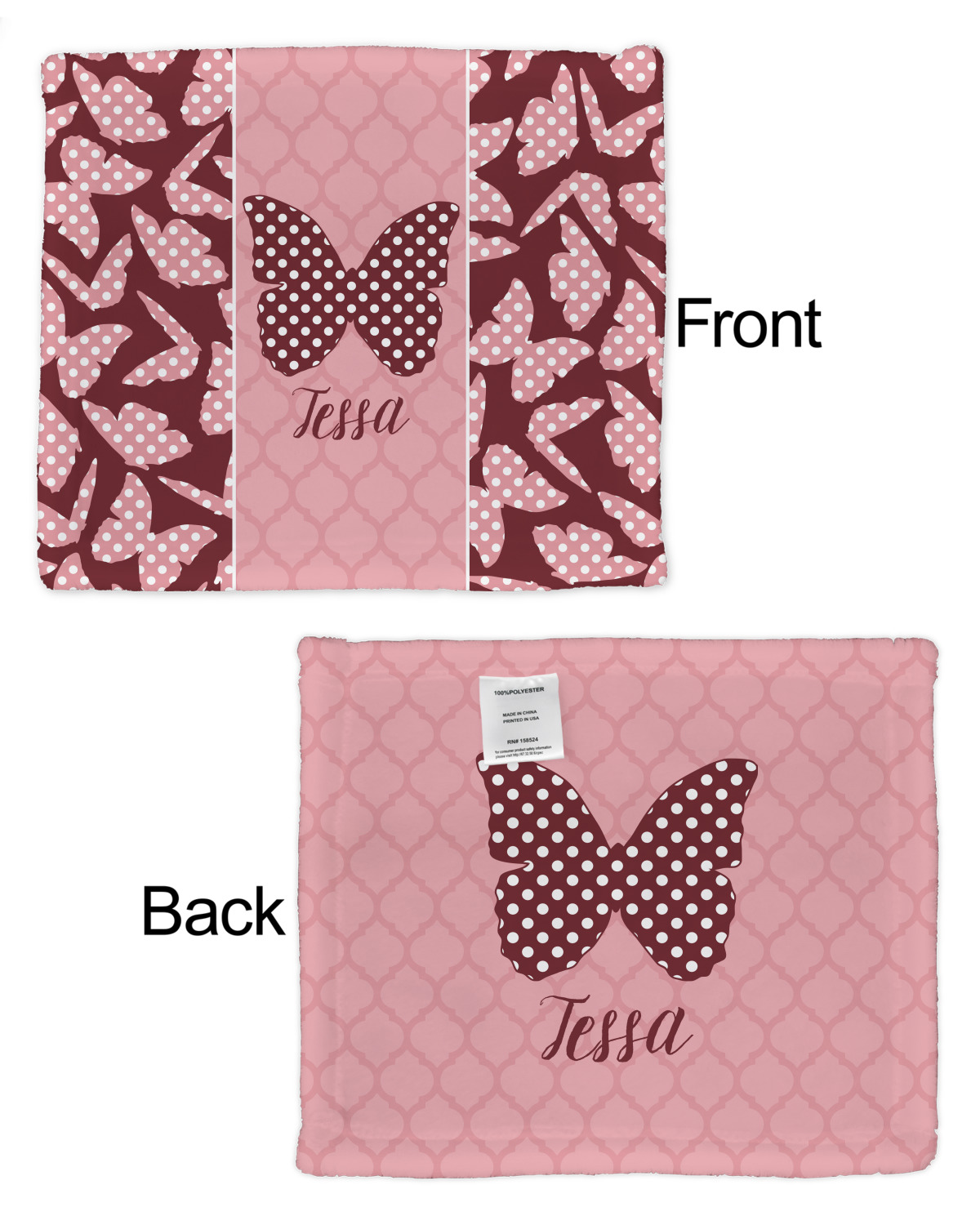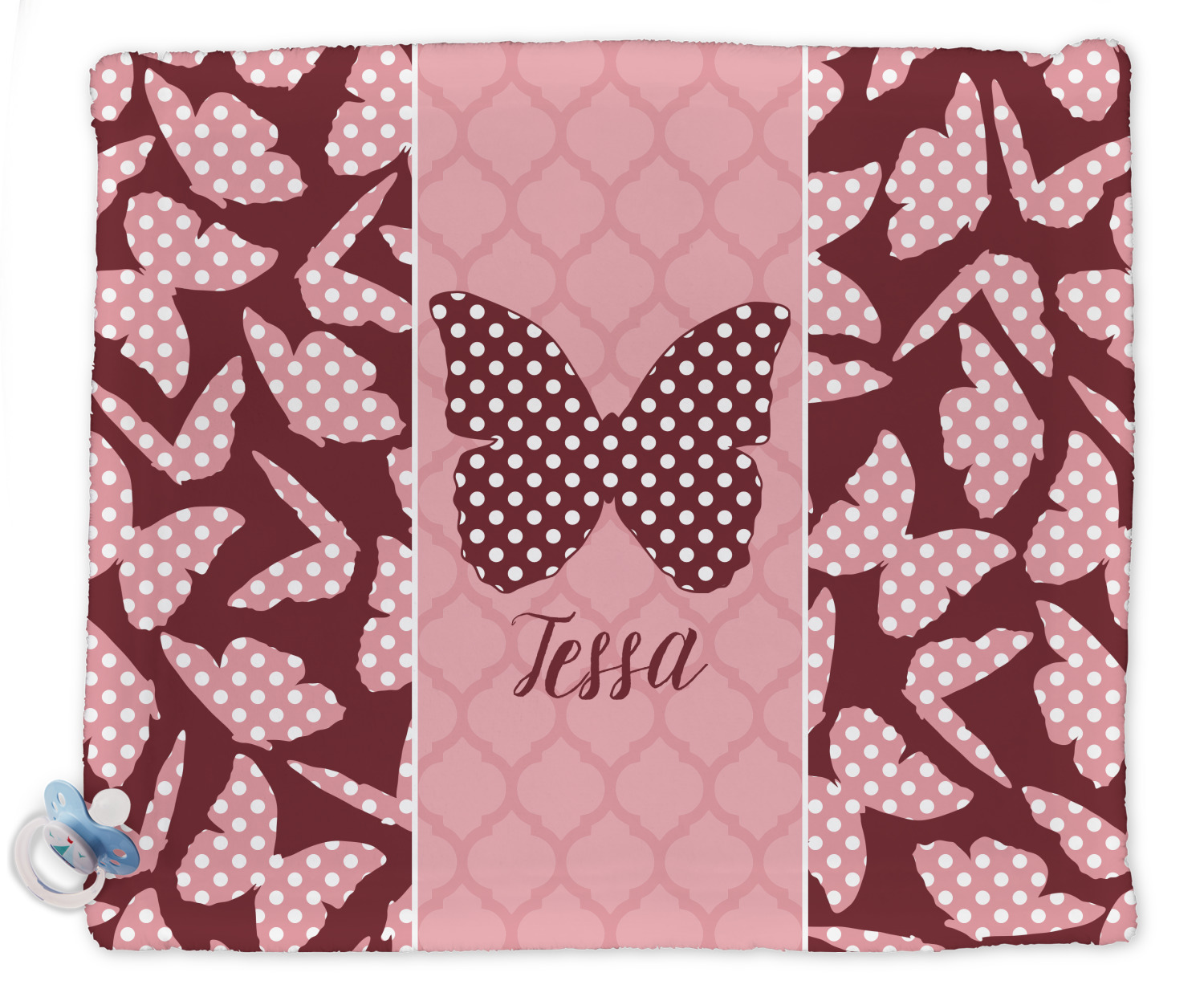 The design is split up in three parts with a polka dot butterfly pattern on either side of the middle section which has a subtle moroccan background. The foreground is personalized with a name and a fun polka dotted butterfly graphic above it. The blush and maroon compliment each other quite nicely. Easily change any of these design elements within the design center.