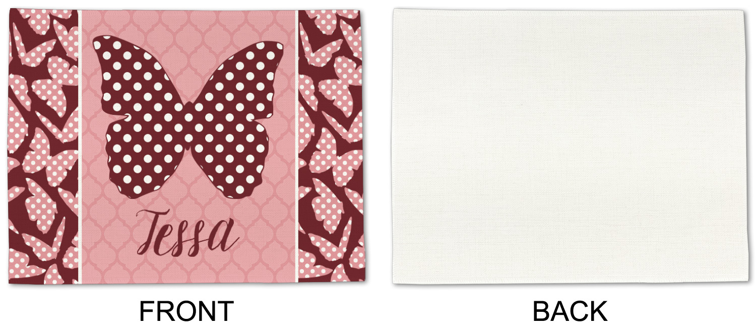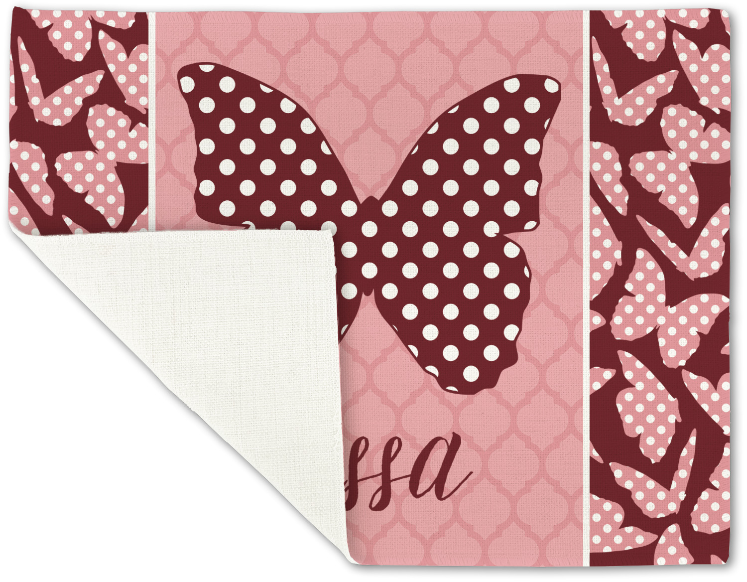 The design is split up in three parts with a polka dot butterfly pattern on either side of the middle section which has a subtle moroccan background. The foreground is personalized with a name and a fun polka dotted butterfly graphic above it. The blush and maroon compliment each other quite nicely. Easily change any of these design elements within the design center.