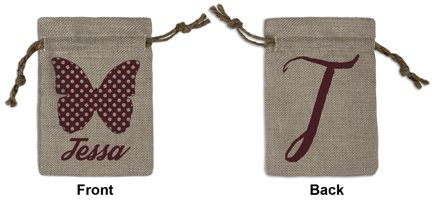 We sell our Burlap Gift Bags in 3 variant sized bags. Made with burlap polyester, each personalized bag can be secured with a twine drawstring pull. Your custom design is available to print on one side or both sides - completely up to you! The sizes of the bags measure approximately 4.5" x 6.5" for the smallest size, 6.5" x 8.0" for the medium size, and 6.5" x 13.5" for the large-sized bag.