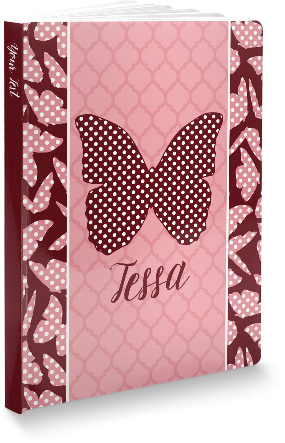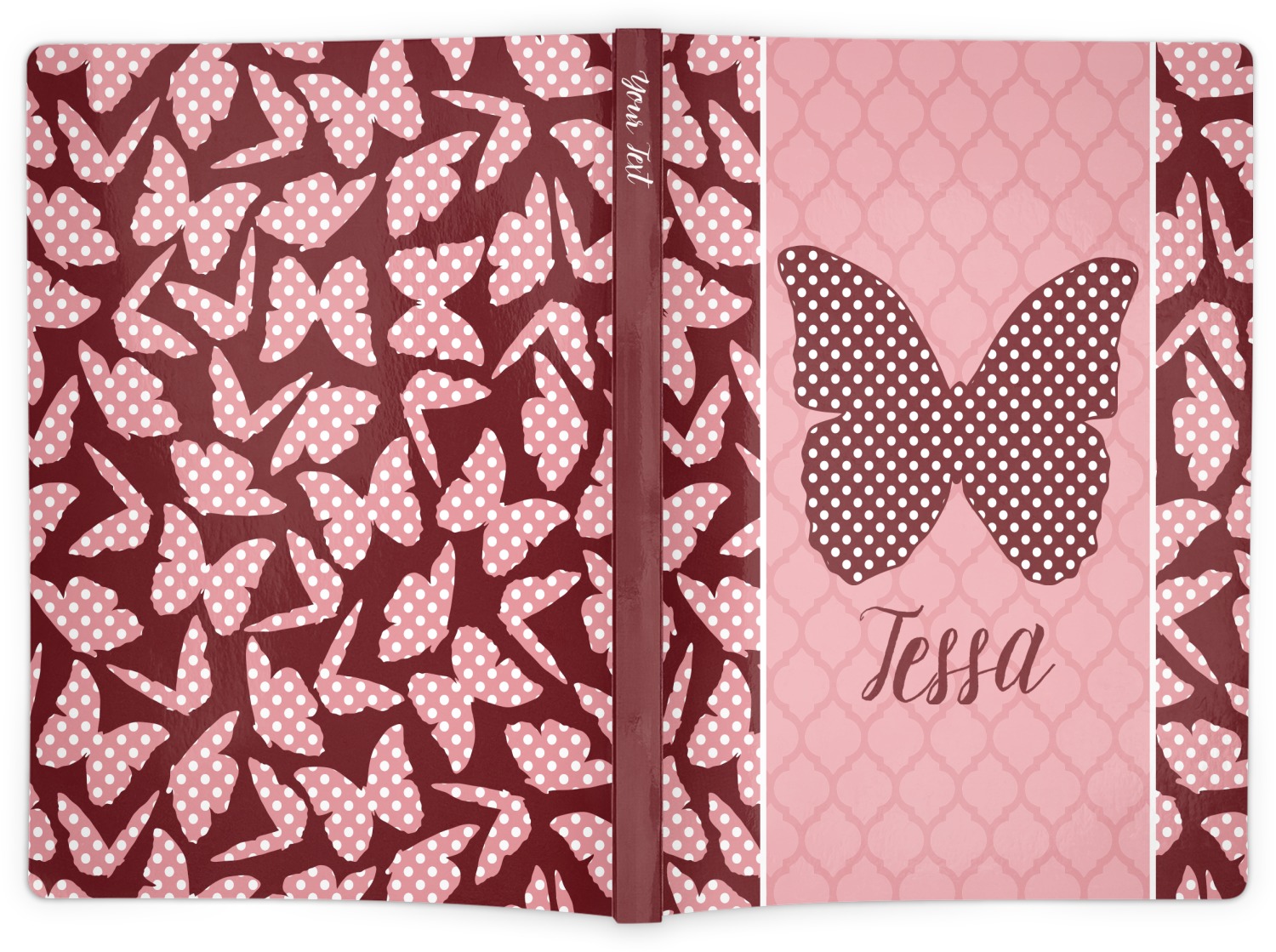 The design is split up in three parts with a polka dot butterfly pattern on either side of the middle section which has a subtle moroccan background. The foreground is personalized with a name and a fun polka dotted butterfly graphic above it. The blush and maroon compliment each other quite nicely. Easily change any of these design elements within the design center.