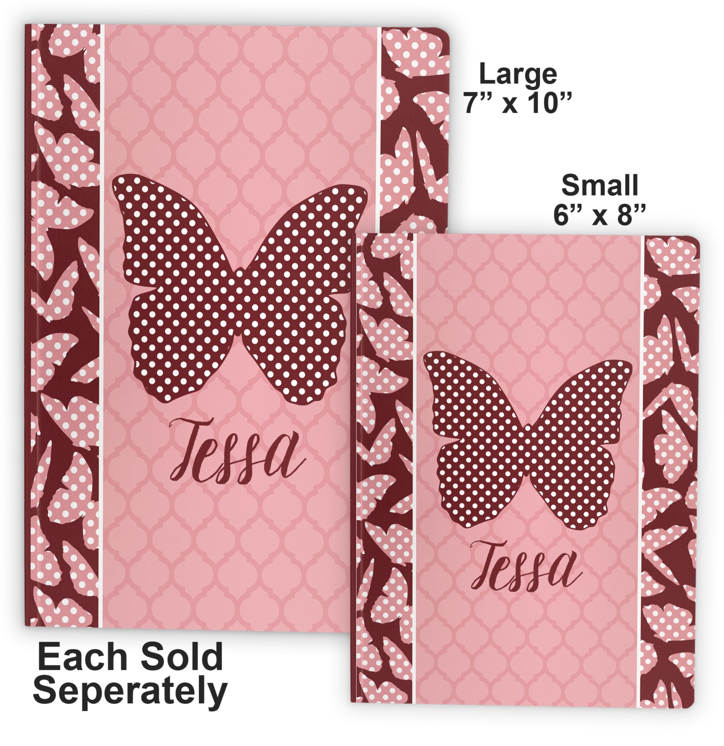 We offer these notebooks in two different sizes. The small notebook is 8" x 5.75", and fits snugly in purses or totes. The large notebook measures at 10" x 7.25", and can be carried in briefcases and backpacks.