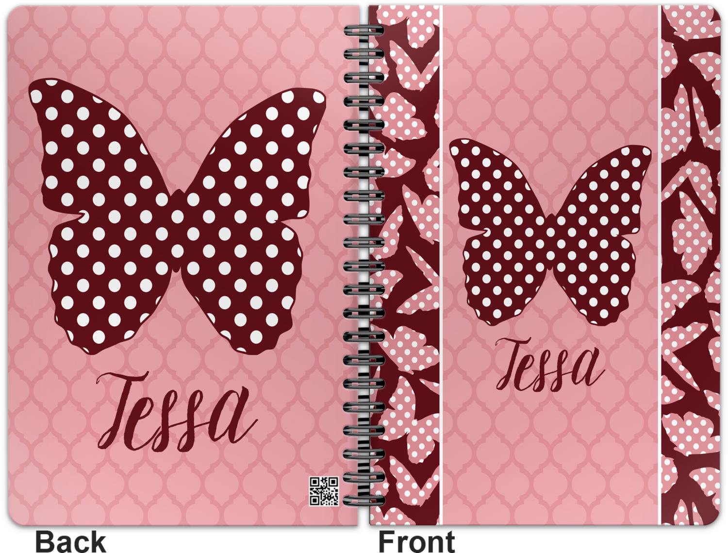 This spiral notebook includes 75 sheets of thick, ruled paper. The front and back of this custom notebook is made of a robust, laminate, plastic covering. We print your personalization on these two panels, underneath a glossy finish, which emphasizes the colors of your design. The two panels and the sheets of paper are held together by a sturdy, black coil. The paper within your bound notebook is perforated for easy, clean tearing.