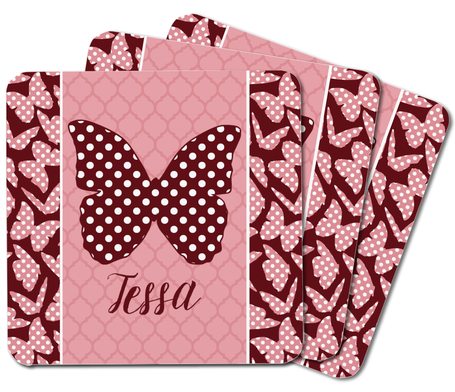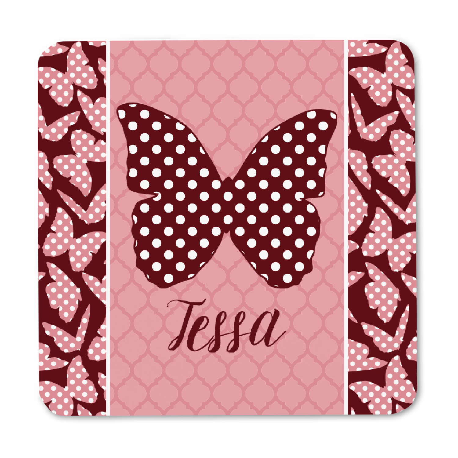 The design is split up in three parts with a polka dot butterfly pattern on either side of the middle section which has a subtle moroccan background. The foreground is personalized with a name and a fun polka dotted butterfly graphic above it. The blush and maroon compliment each other quite nicely. Easily change any of these design elements within the design center.