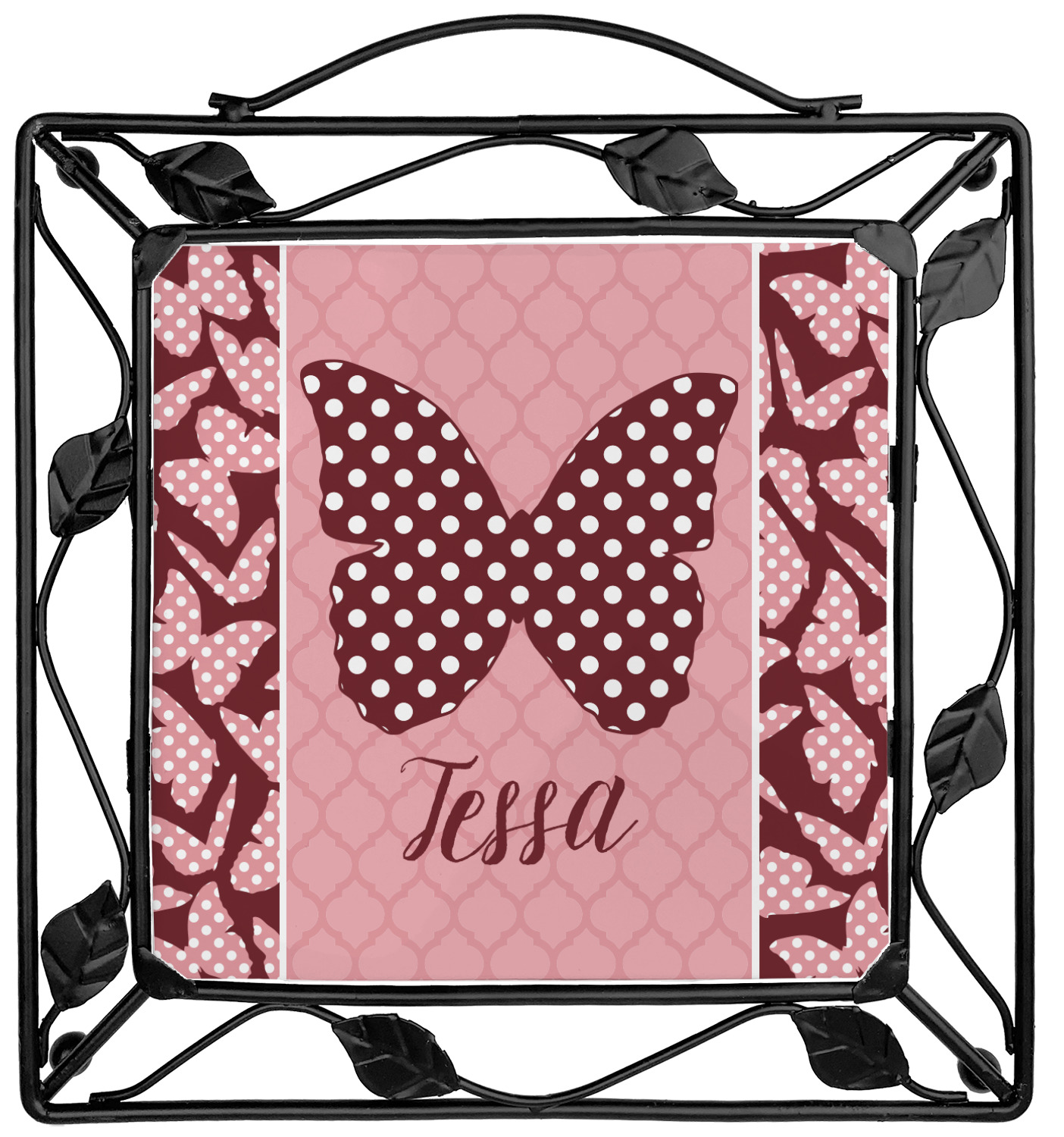 Our square trivets are made from a durable, wrought iron. This model features 4 small half circles, one on each corner, and a larger ring of iron that circles the central, customized tile. Each of the 4 corners has a round foot on its bottom for stability. This trivet is 8.75 by 8.75 inches, but the central tile measures at 6 inches on both sides.