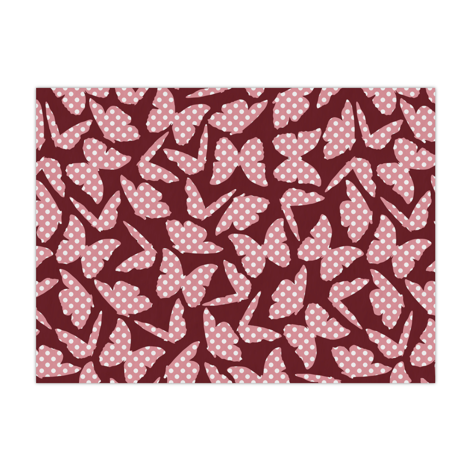 The design is split up in three parts with a polka dot butterfly pattern on either side of the middle section which has a subtle moroccan background. The foreground is personalized with a name and a fun polka dotted butterfly graphic above it. The blush and maroon compliment each other quite nicely. Easily change any of these design elements within the design center.
