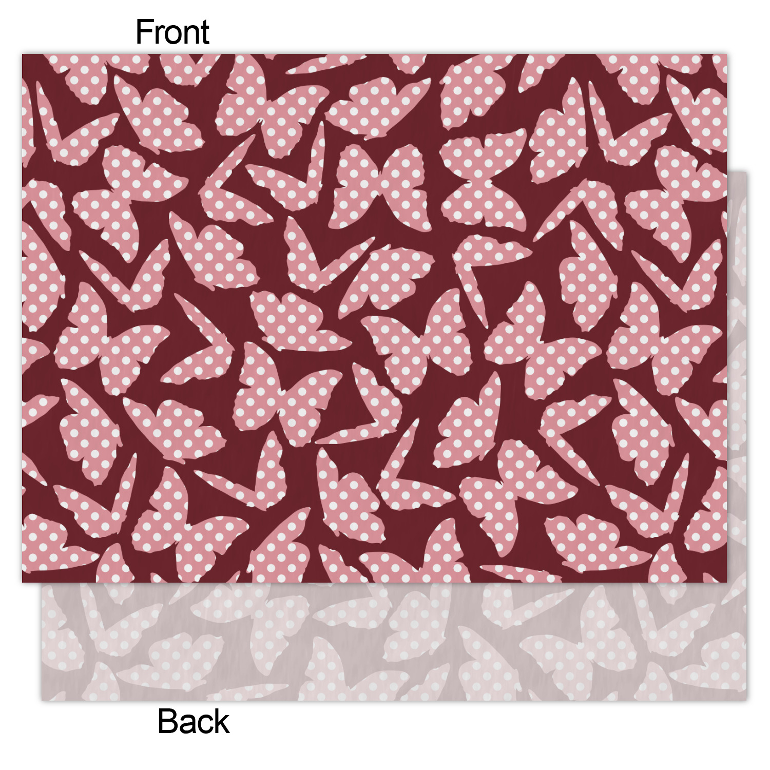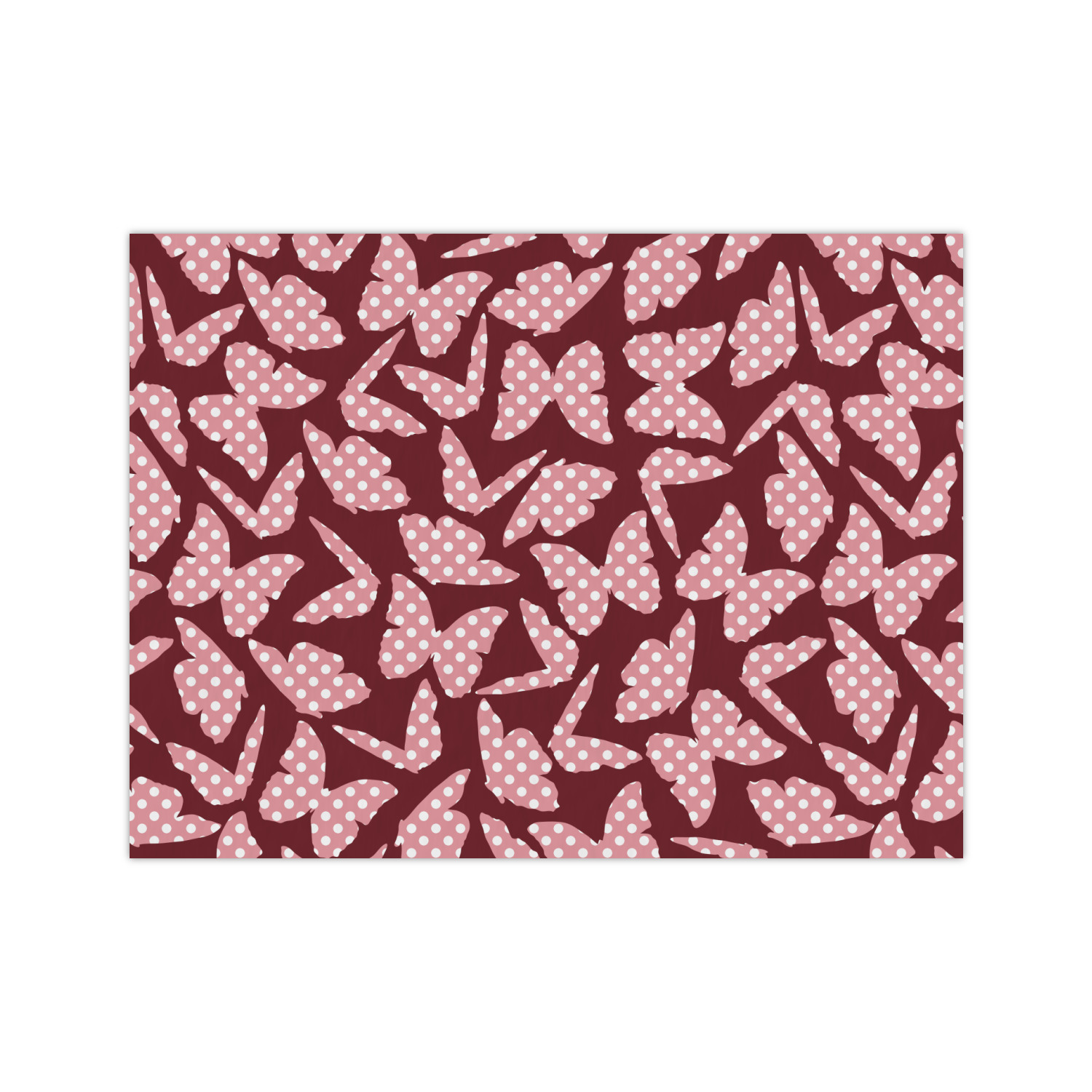 The design is split up in three parts with a polka dot butterfly pattern on either side of the middle section which has a subtle moroccan background. The foreground is personalized with a name and a fun polka dotted butterfly graphic above it. The blush and maroon compliment each other quite nicely. Easily change any of these design elements within the design center.