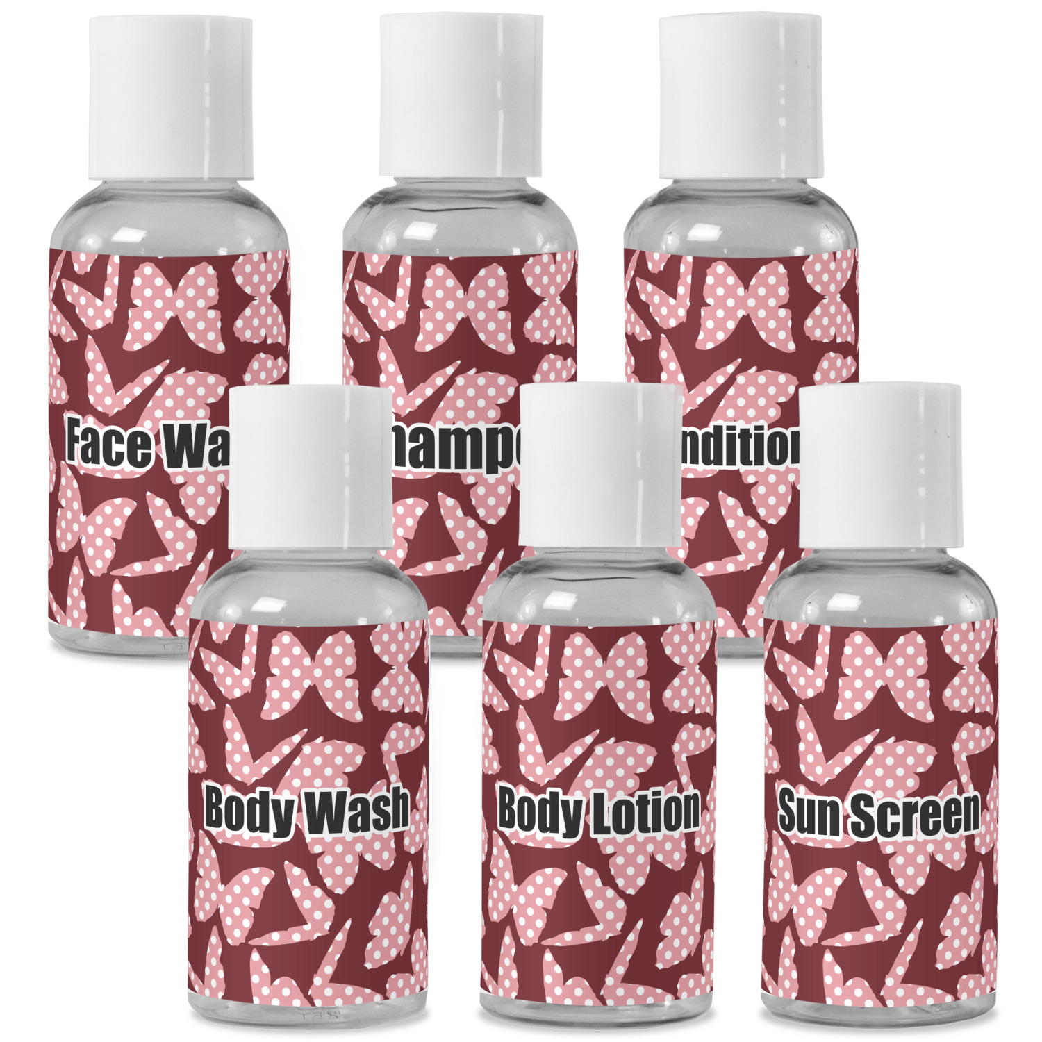 These soap and lotion travel bottles are the perfect place to start. Each set comes with 6 clear plastic bottles with white pop top lids. The bottles are cylindrical and can hold approximately 2.7oz. Perfect for plane travel!