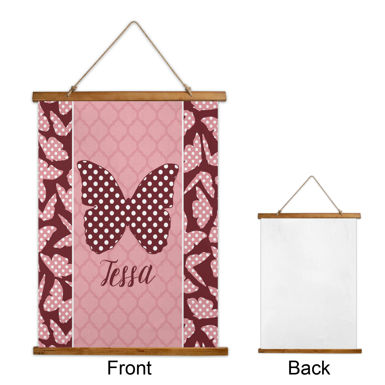The design is split up in three parts with a polka dot butterfly pattern on either side of the middle section which has a subtle moroccan background. The foreground is personalized with a name and a fun polka dotted butterfly graphic above it. The blush and maroon compliment each other quite nicely. Easily change any of these design elements within the design center.