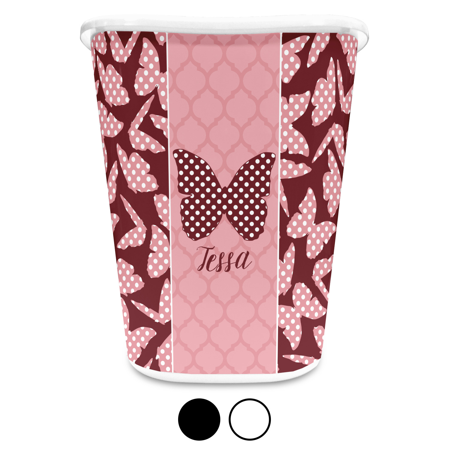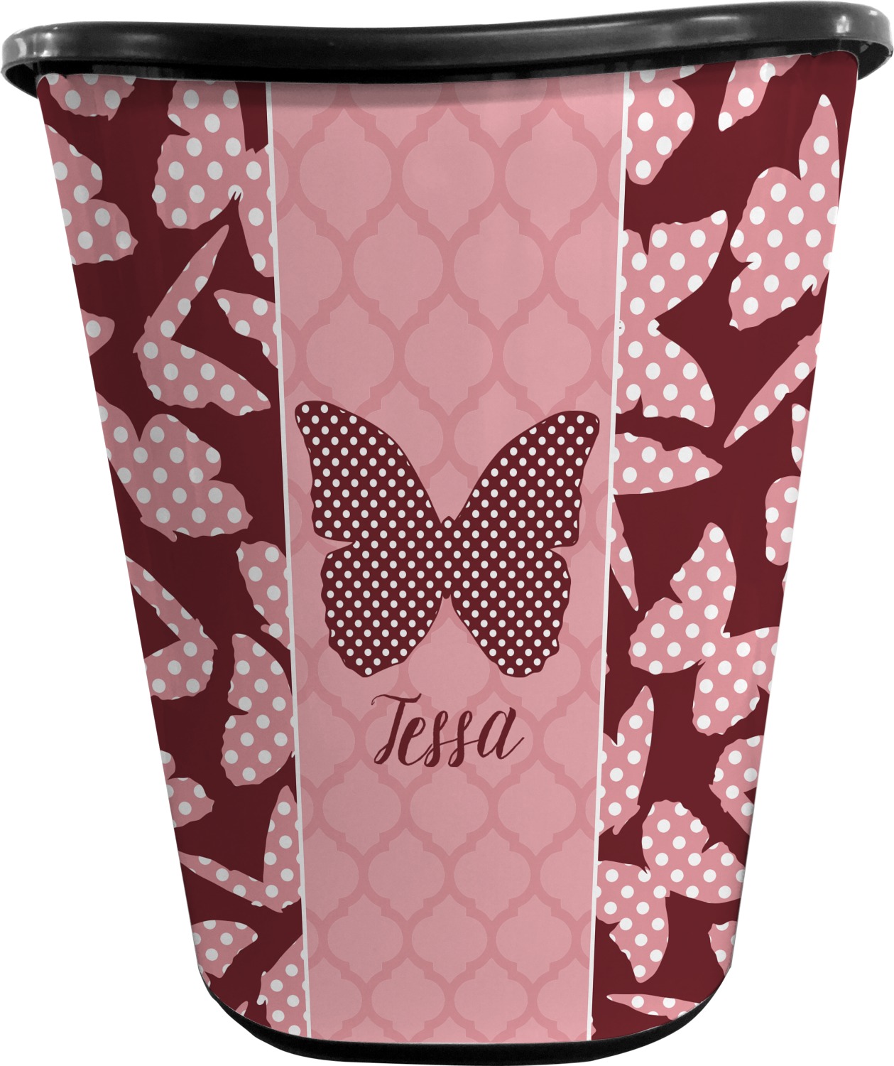 The design is split up in three parts with a polka dot butterfly pattern on either side of the middle section which has a subtle moroccan background. The foreground is personalized with a name and a fun polka dotted butterfly graphic above it. The blush and maroon compliment each other quite nicely. Easily change any of these design elements within the design center.