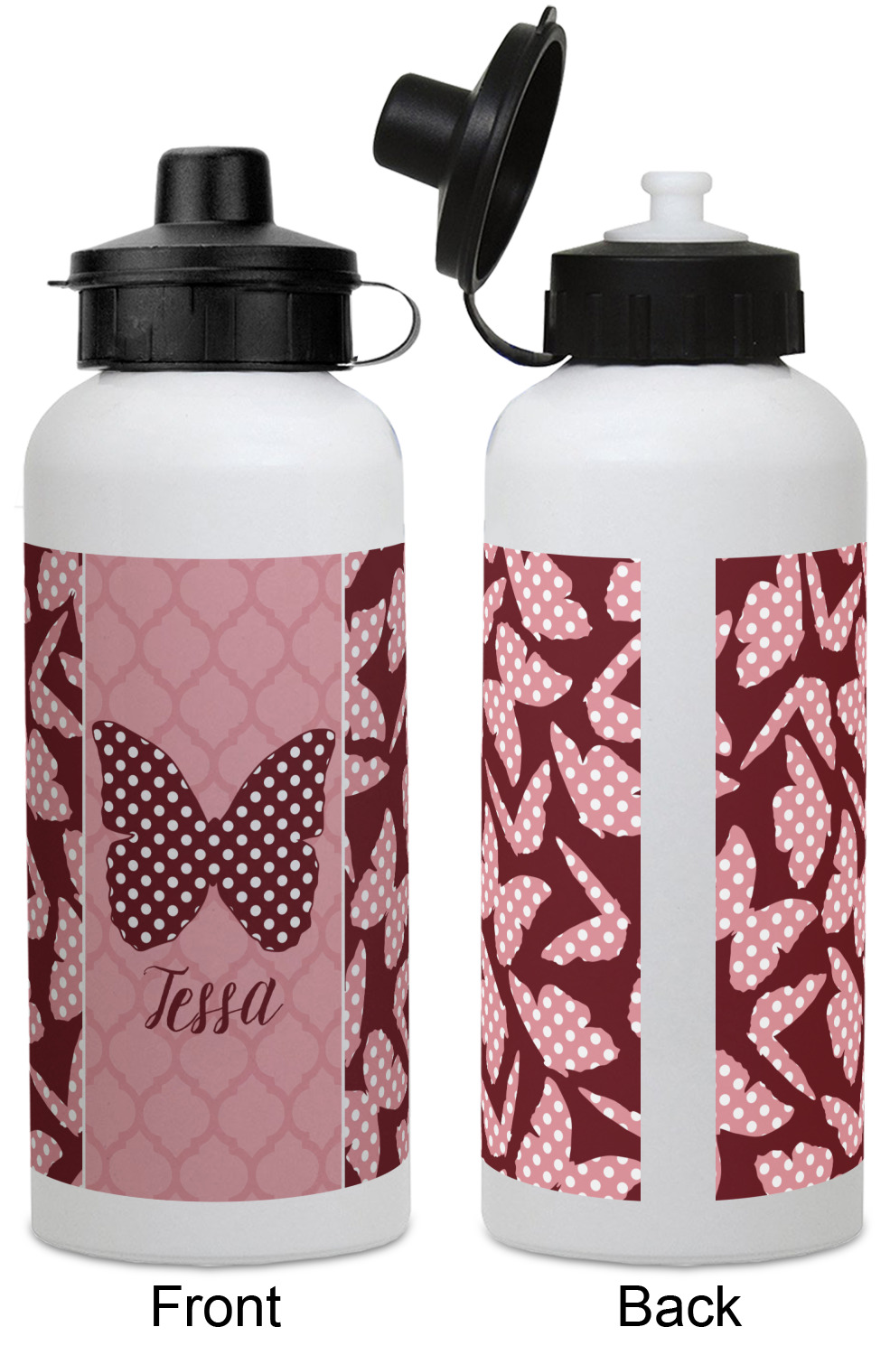 The design is split up in three parts with a polka dot butterfly pattern on either side of the middle section which has a subtle moroccan background. The foreground is personalized with a name and a fun polka dotted butterfly graphic above it. The blush and maroon compliment each other quite nicely. Easily change any of these design elements within the design center.